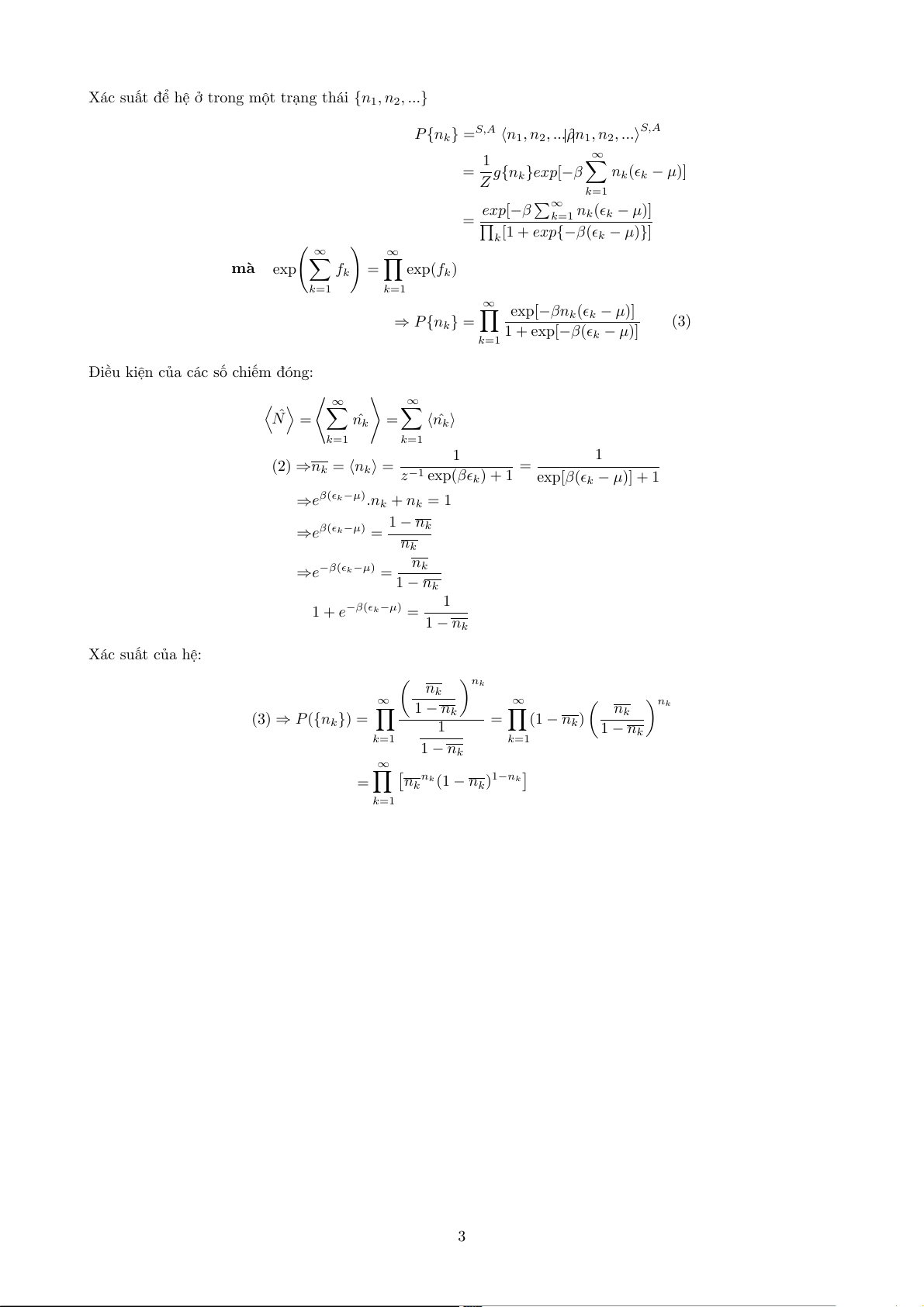 1 + e−β(ϵk−µ) = 1 − nk Xác suất của hệ: n nk k ∞ ∞ 1 − n n nk (3) ⇒ Y Y P ({n k k k }) = = (1 − n 1 k ) 1 − nk k=1 k=1 1 − nk ∞ Y = n nk k (1 − nk)1−nk k=1 3