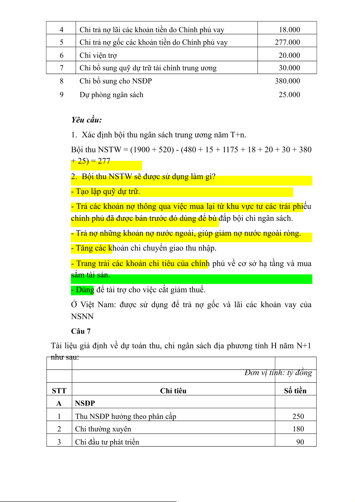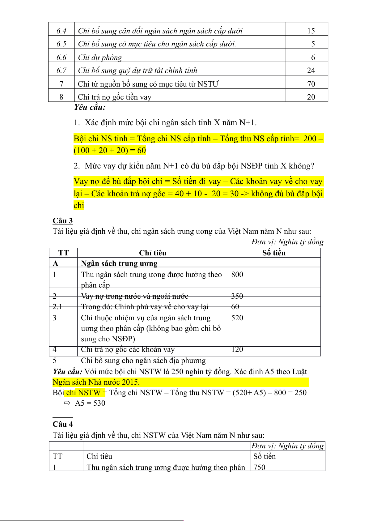 Bội chi NSTW = Tổng chi NSTW – Tổng thu NSTW = (520+ A5) – 800 = 250 A5 = 530 Câu 4