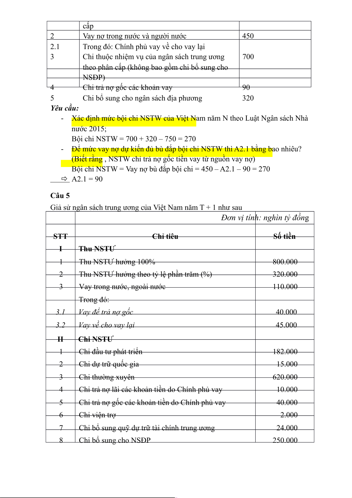 Bội chi NSTW = Vay nợ bù đắp bội chi = 450 – A2.1 – 90 = 270 A2.1 = 90 Câu 5