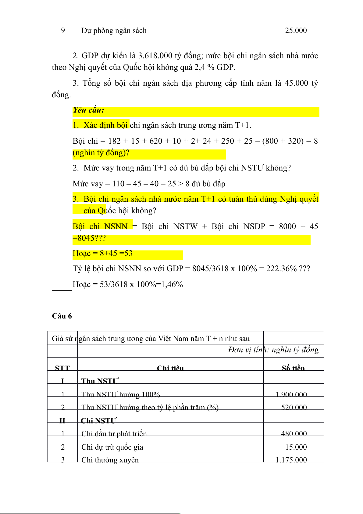 Tỷ lệ bội chi NSNN so với GDP = 8045/3618 x 100% = 222.36% ??? Hoặc = 53/3618 x 100%=1,46% Câu 6