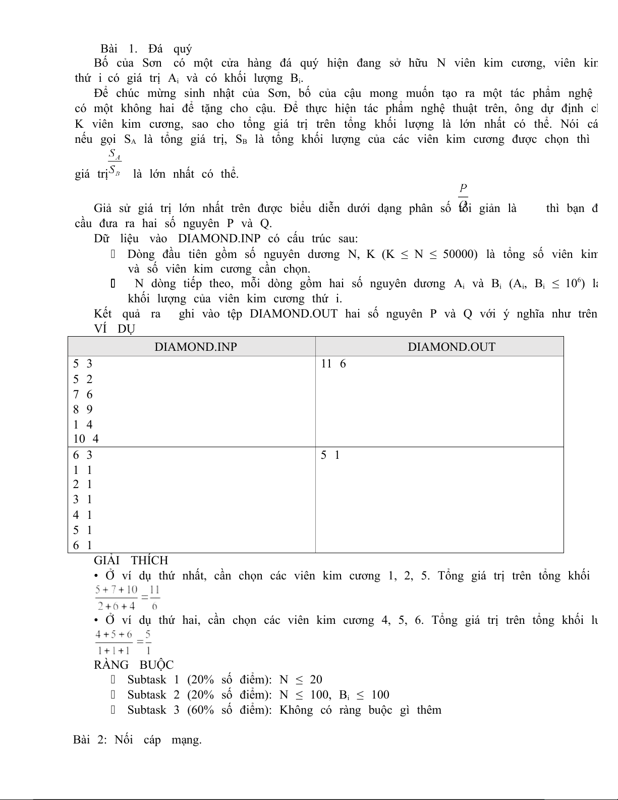 Kết quả ra ghi vào tệp DIAMOND.OUT hai số nguyên P và Q với ý nghĩa như trên VÍ DỤ DIAMOND.INP DIAMOND.OUT 5 3 11 6 5 2 7 6 8 9 1 4 10 4 6 3 5 1 1 1 2 1 3 1 4 1 5 1 6 1 GIẢI THÍCH