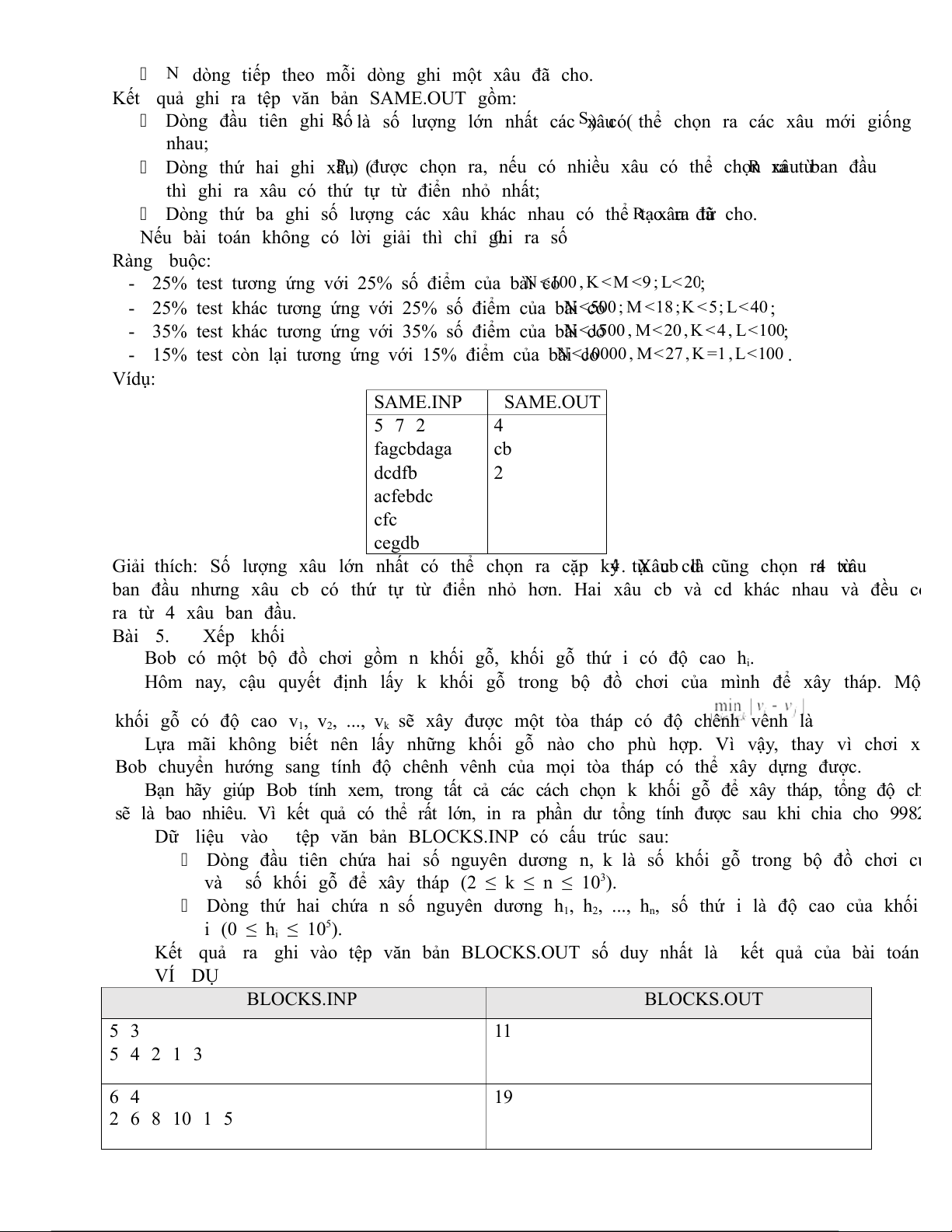 Kết quả ra ghi vào tệp văn bản BLOCKS.OUT số duy nhất là kết quả của bài toán VÍ DỤ BLOCKS.INP BLOCKS.OUT 5 3 11 5 4 2 1 3 6 4 19 2 6 8 10 1 5 4 3 2 1 2 2 3 RÀNG BUỘC
