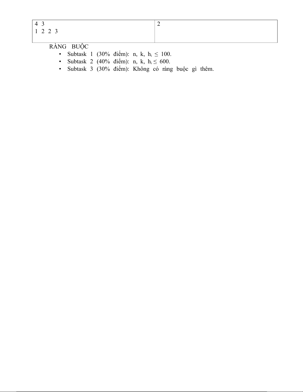 • Subtask 1 (30% điểm): n, k, hi ≤ 100.