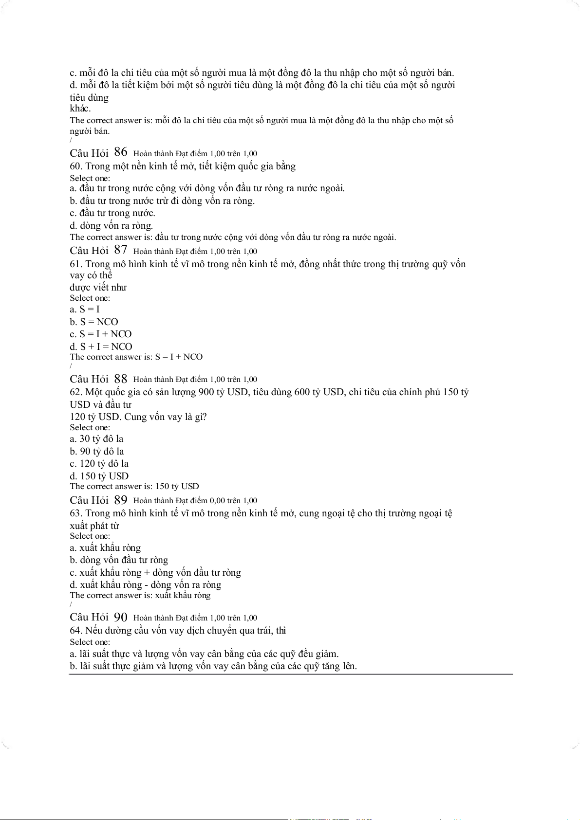 61. Trong mô hình kinh tế vĩ mô trong nền kinh tế mở, đồng nhất thức trong thị trường quỹ vốn vay có thể được viết như Select one: a. S = I b. S = NCO c. S = I + NCO d. S + I = NCO