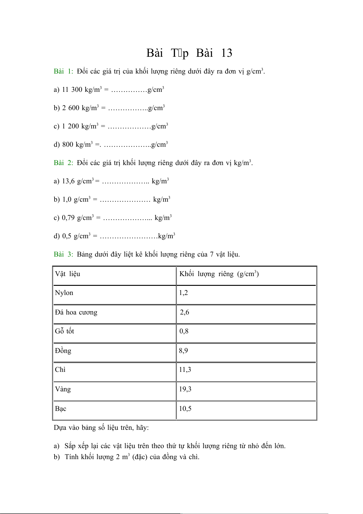 Bài 2: Đổi các giá trị khối lượng riêng dưới đây ra đơn vị kg/m .3