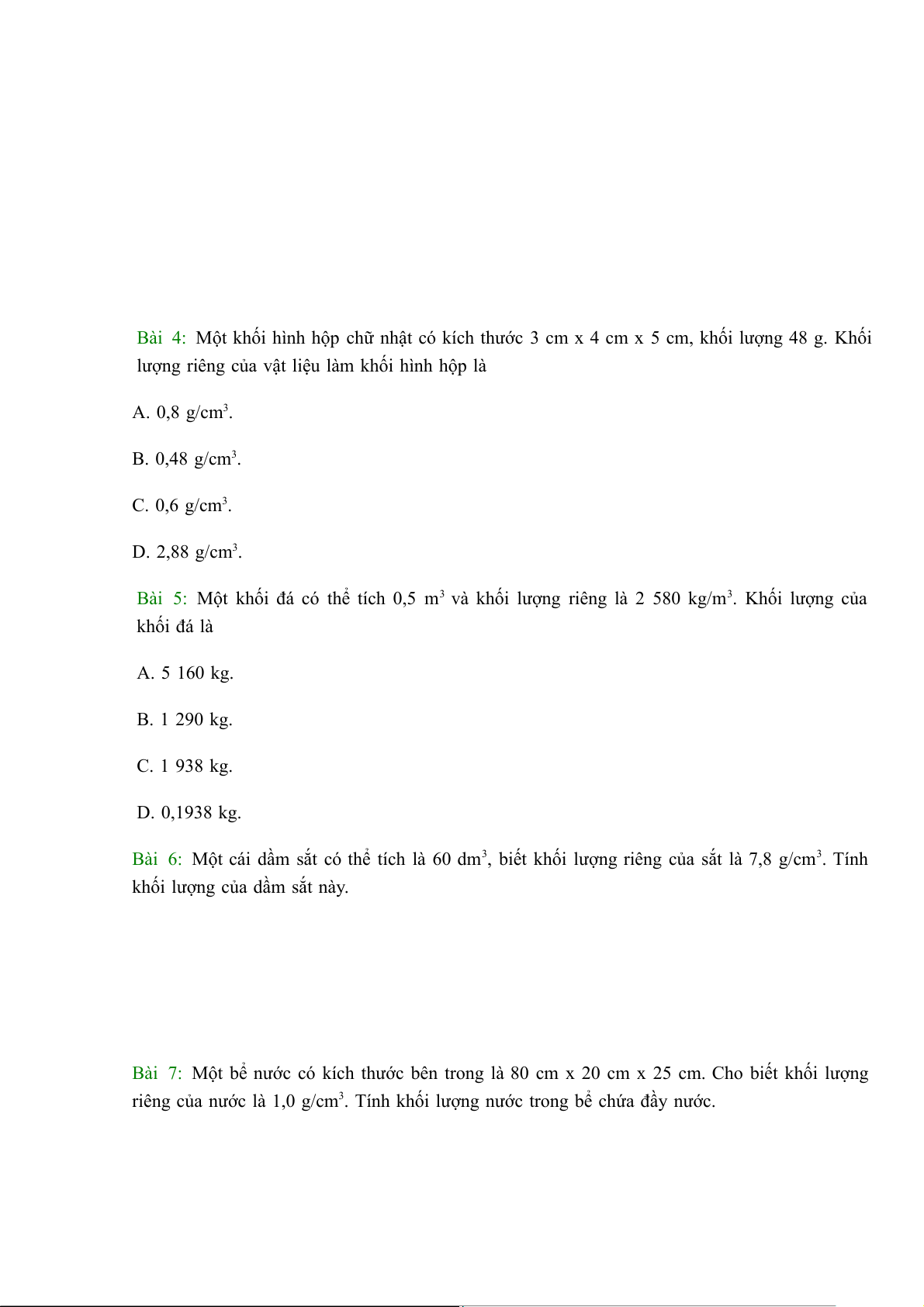 Bài 4: Một khối hình hộp chữ nhật có kích thước 3 cm x 4 cm x 5 cm, khối lượng 48 g. Khối