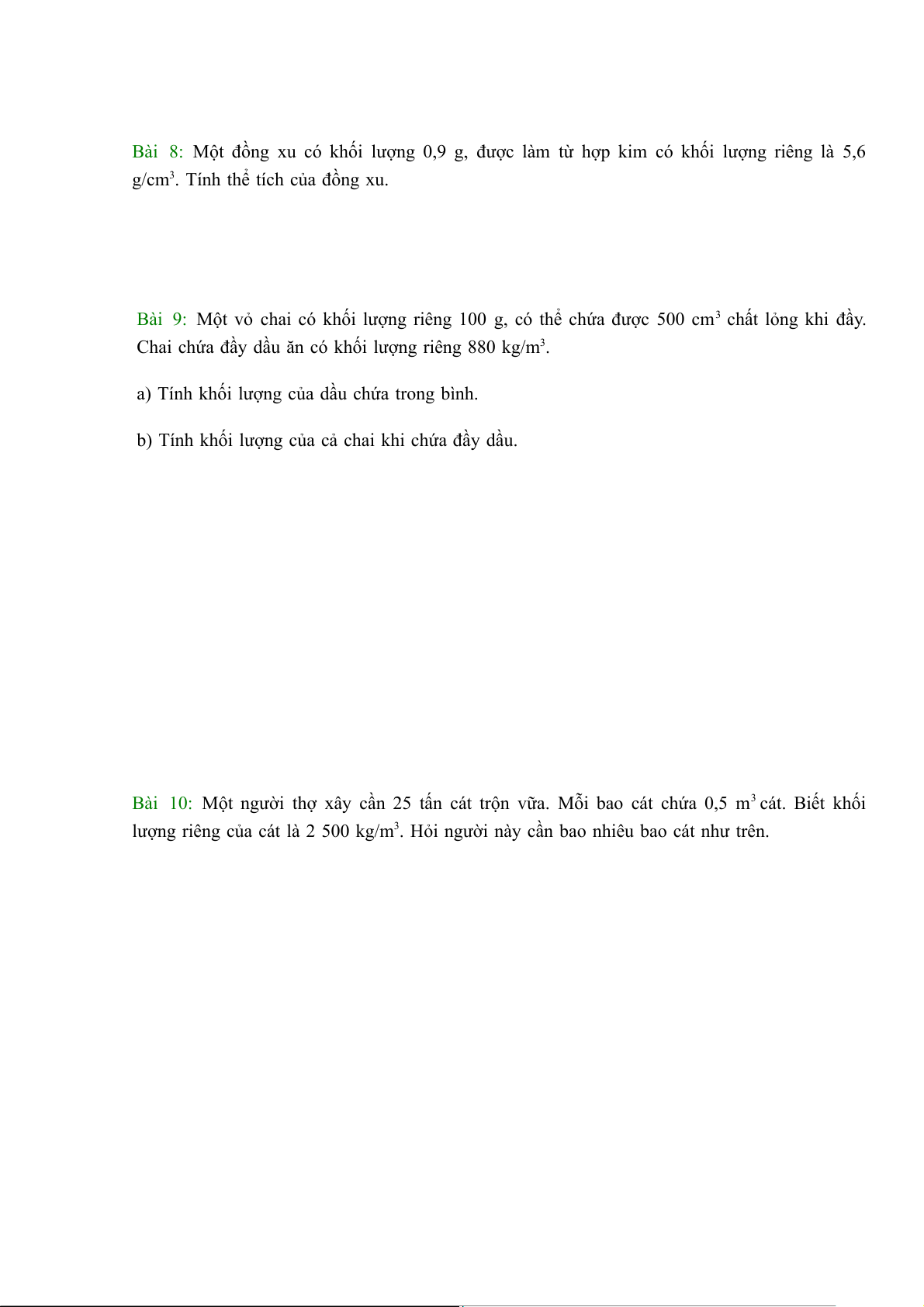 Bài 9: Một vỏ chai có khối lượng riêng 100 g, có thể chứa được 500 cm 3 chất lỏng khi đầy.