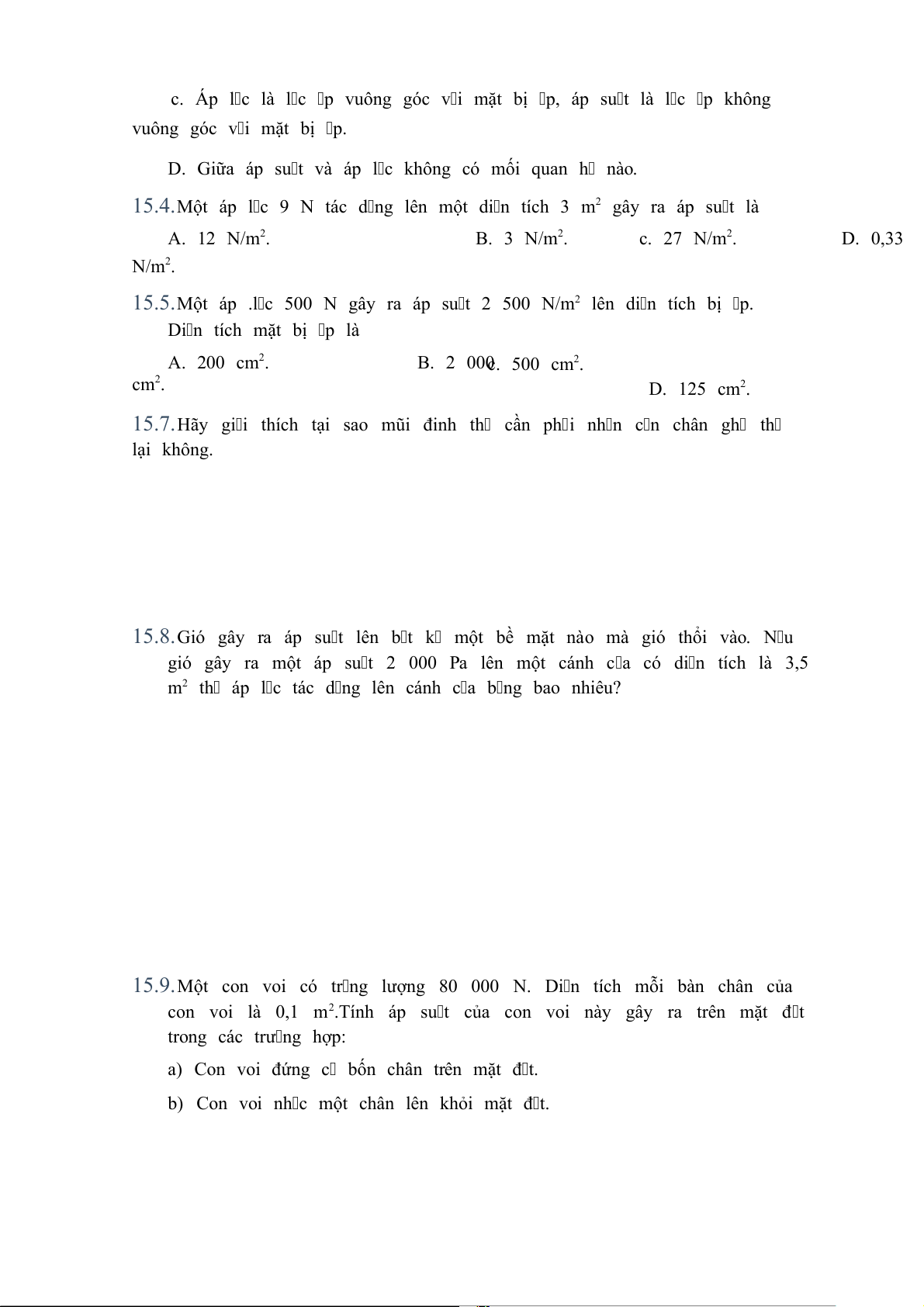 15.4.Một áp l c 9 N tác d ng lên một di n tích 3 m2 gây ra áp su t là A. 12 N/m2. B. 3 N/m .2 c. 27 N/m .2 D. 0,33 N/m .2