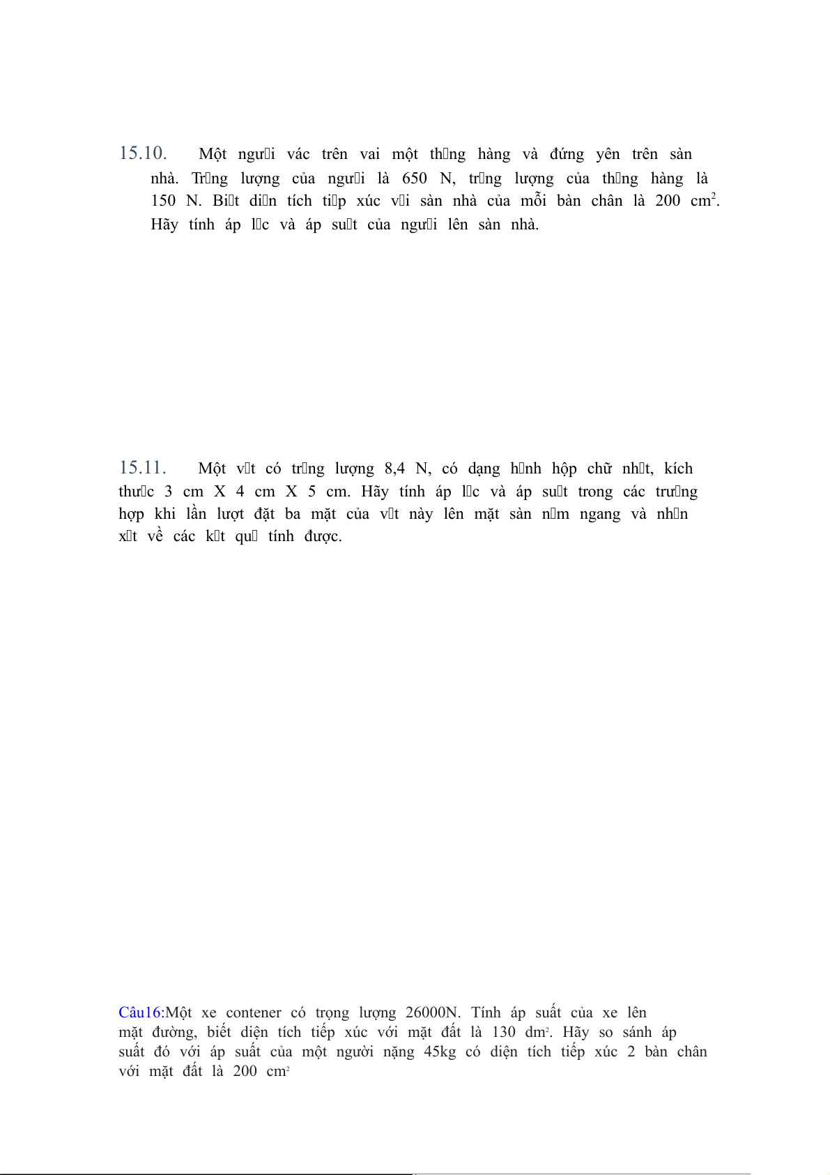 Câu 16: Một xe contener có trọng lượng 26000N. Tính áp suất của xe lên