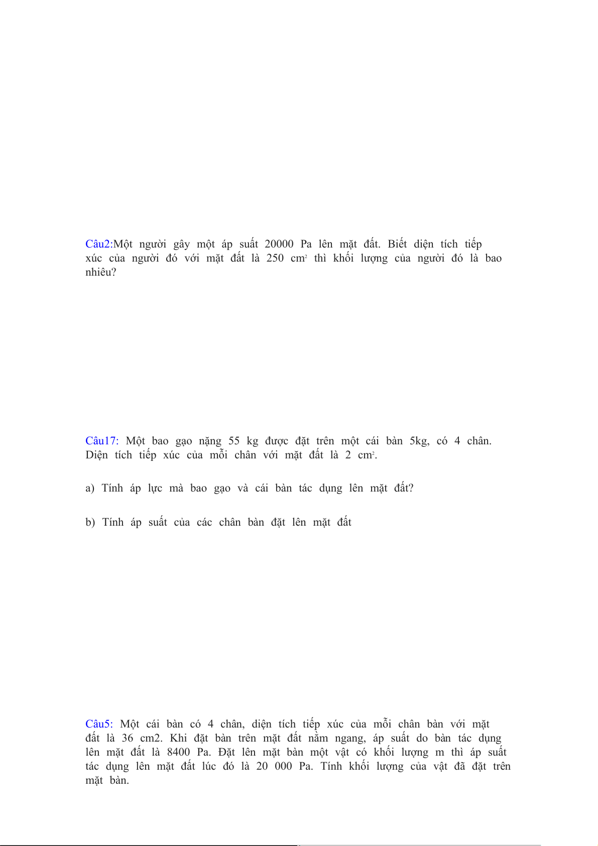 Câu 2: Một người gây một áp suất 20000 Pa lên mặt đất. Biết diện tích tiếp