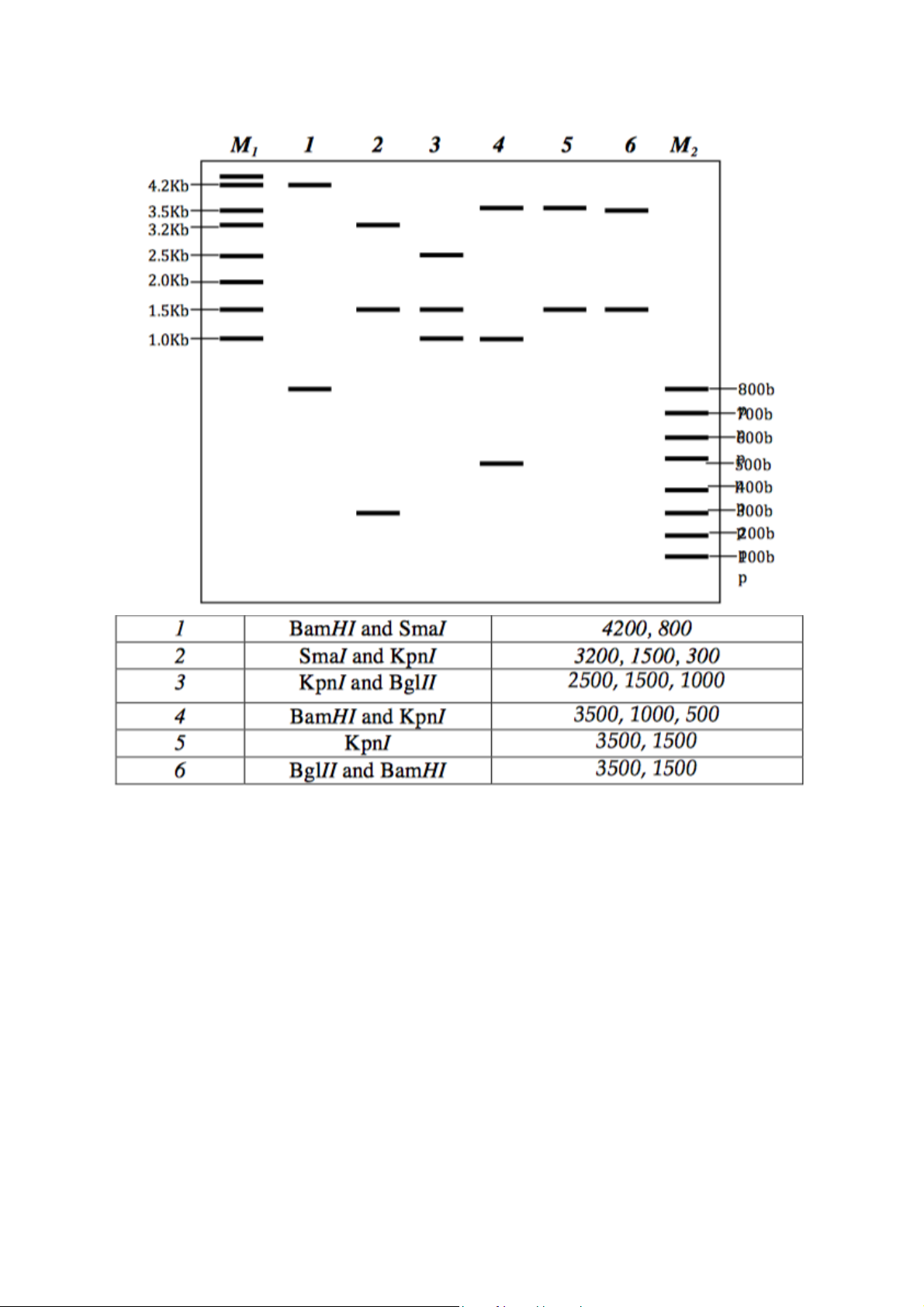 một loạt phản ứng cắt hạn chế và thu được kết quả sau bằng phương pháp điện di trên gel agarose.