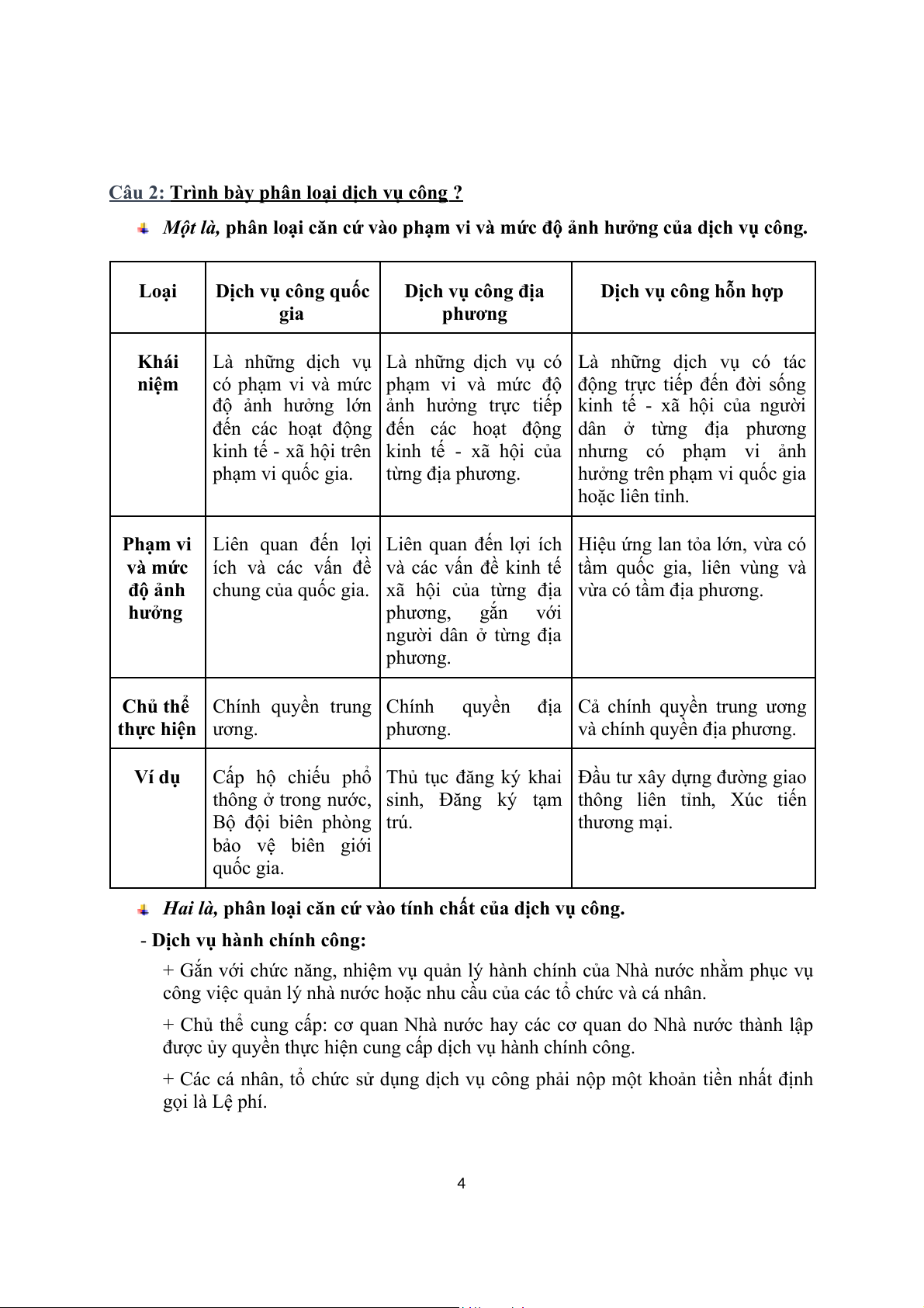 Một là, phân loại căn cứ vào phạm vi và mức độ ảnh hưởng của dịch vụ công. Loại