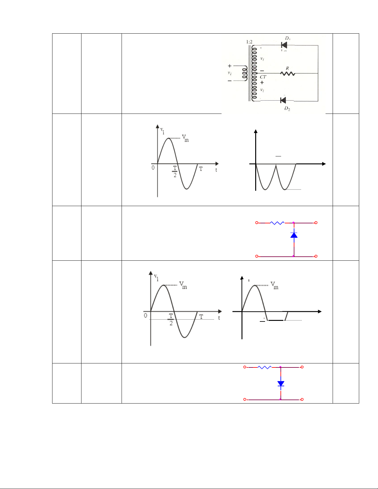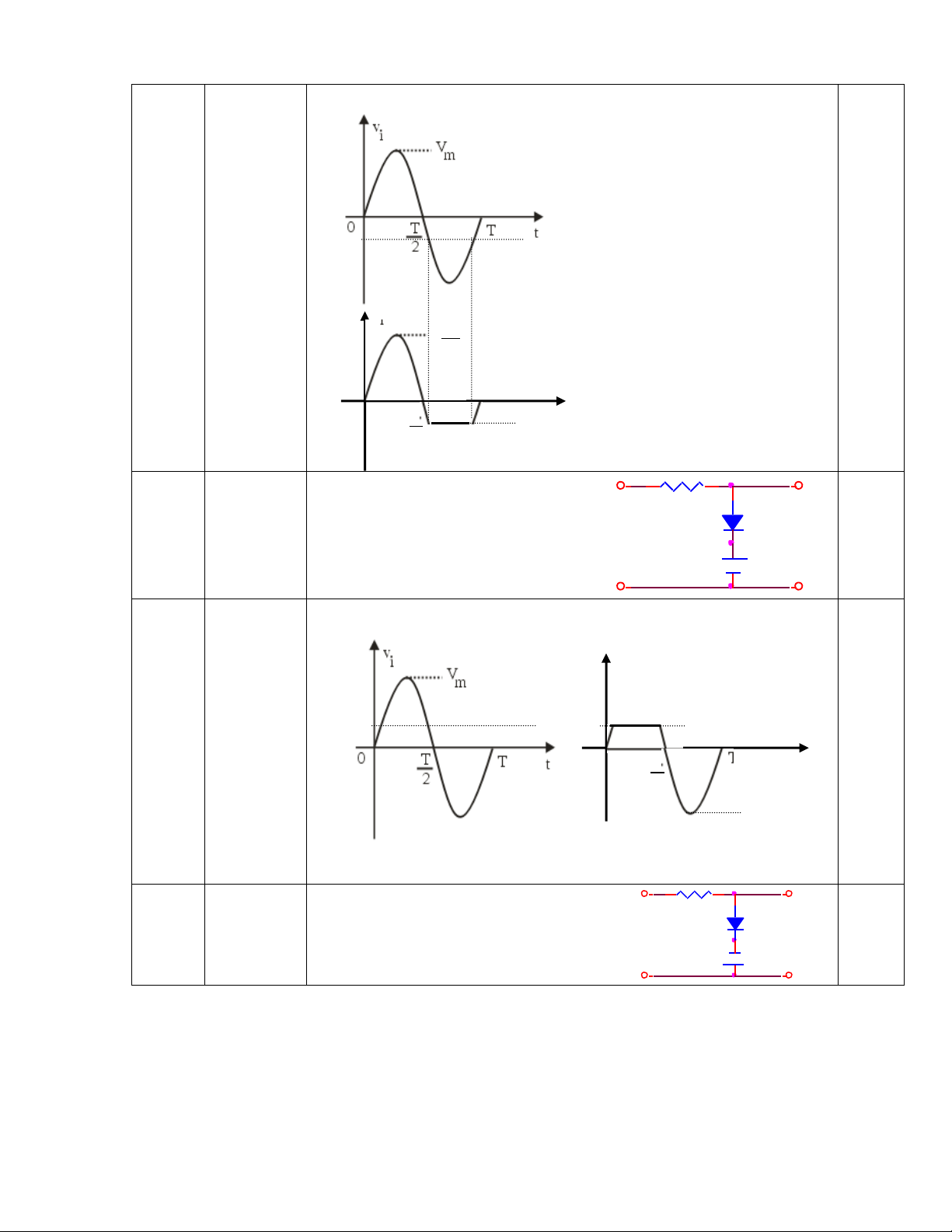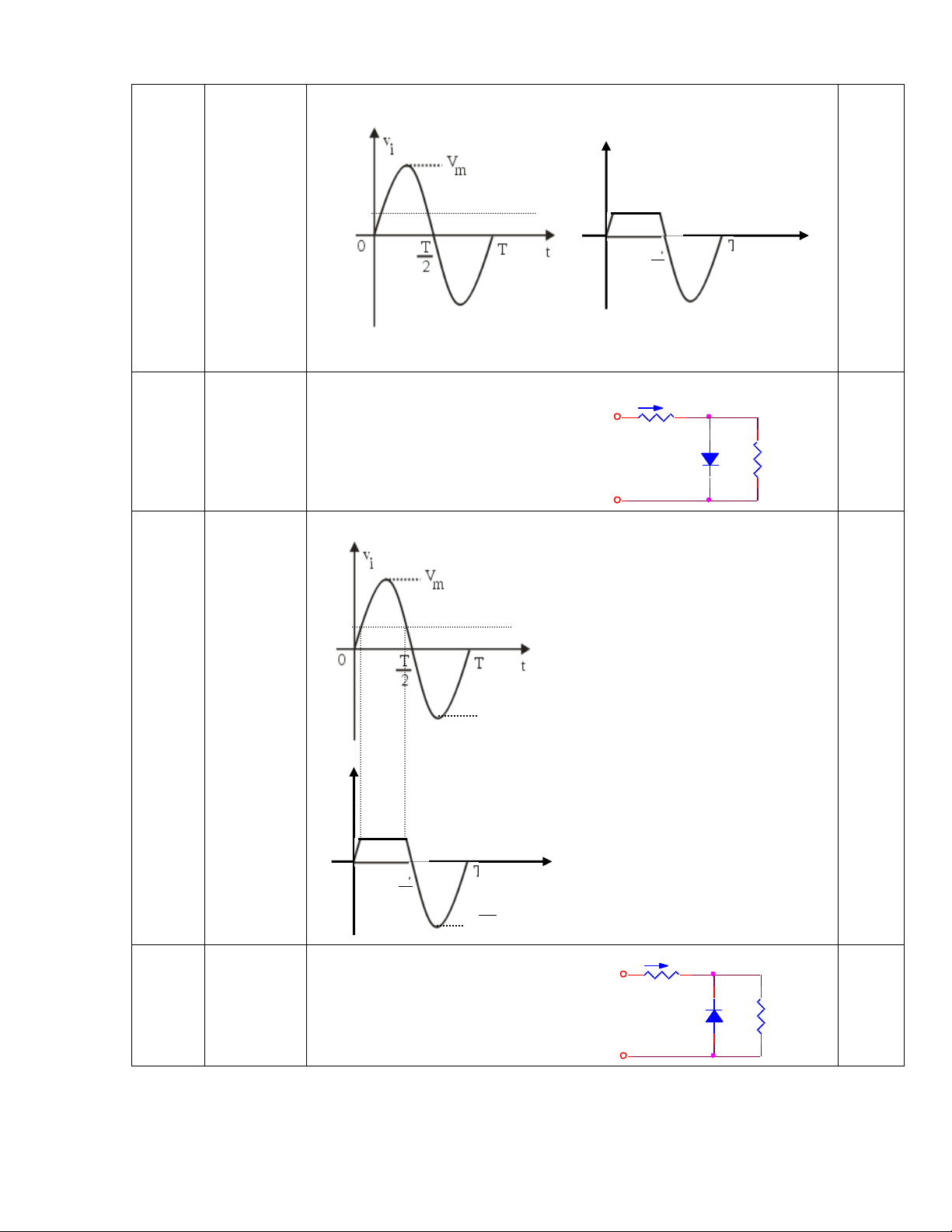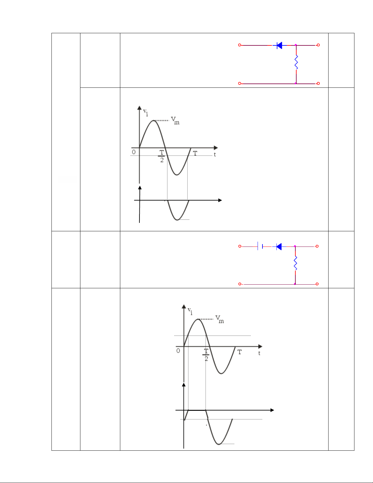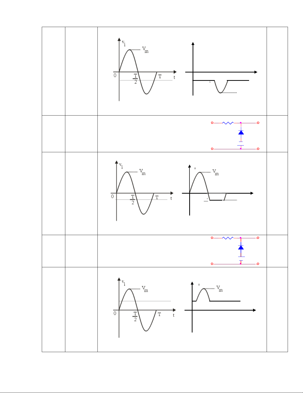 Cho Vi. Vẽ dạng sóng ngõ ra Vo Với Diode là Si. S i V R V i = Vmsin(wt) O VI Đáp án Trang 2 2 Câu hỏi Si 1.5 + + Vi 3.3k Vo - - Đáp án V T =-0.7V 0 t -V m +VT 3 Câu hỏi 1.5 Si Idea l + + V 8.2k Vi Vo - - Đáp án VT = V+0.7V Vo 0 t -VT -Vm - VT Trang 3 4 Câu hỏi 1.5 + + v Si Vi R Vo - - Đáp án VT = -V-0.7V Vo 0 t VT -Vm - VT 5 Câu hỏi 1.5 + + v Si Vi R Vo - - Đáp án VT = V+ 0.7v 6 Câu hỏi 1.5 + + v Si Vi R Vo - - Trang 4 Đáp án VT = V-0.7V V Vm + V o T VT = V-0.7V t 0 7 Câu hỏi 2 + Si Si Vo + Si Si - - Đáp án VT1 = 1.4V VT2 = -1.4V Vo 0 t -Vm - VT2 Trang 5 8 Câu hỏi 2 + Si Si Vo + Si Si - - Đáp án V T1 = 1.4V VT2 = -1.4V Vm - VT1 0 t 9 Câu hỏi 2 + Ide al Diode s Vo + 5.6k 5.6k 5.6k - - Đáp án VT1 = (Vm -0.7v)/2 VT2 = (-Vm +0.7v)/2 Vm - VT 0 t Trang 6 10 Câu hỏi 1.5 + Si 5.6k Vo Si 5.6k 5.6k - Đáp án VT1 = (Vm -0.7v)/2 VT2 = (-Vm +0.7v)/2 Vm - VT1 0 t 11 Câu hỏi 2 Đáp án Trang 7 12 Câu hỏi 2 Đáp án V0 T T 2 0 t -Vm 13 Câu hỏi 1 2.2K + + Vi = 11 0V (rms) Idea l Vo (Vdc) Si - - Đáp án V0 0 T T t - 0.7V - 0.7V 2 14 Câu hỏi 1 + + R S Vi i Vo - - Trang 8 Đáp án V0 VT = 0.7V 0.7V 0 T T t 2 15 Câu hỏi 2 i R + + 1K Si 10K Vo - - Đáp án VT =0.77V Vm V0 0.7V 0 T T t 2 10 Vm 11 16 Câu hỏi R 2 + + 1K Si 10K Vo - - Trang 9 Đáp án -0.77V V0 10Vm 11 0 T T t -0.7V 2 17 Câu hỏi 1.5 + 5.6k + Si Vi Vo v - - Đáp án V0 VT = v+ 0.7V VT 0 T T t 2 Vm 18 Câu hỏi 1.5 + + R Vi Vo - v - Trang 10 Đáp án V0 0 V t T VT = -v+ 0.7V Vm 19 Câu hỏi 1.5 + + R S Vi i Vo - v - Đáp án V0 0 T T t VT = -v - 0.7V VT 2 20 Câu hỏi 1.5 + + R S Vi i Vo - v - Đáp án V0 V VT T = v + 0.7V 0 t Trang 11 21 Câu hỏi 1.5 + + R Si Si Vi Vo v v 1 2 - - Đáp án V0 VT2= v2 - 0.7V VT2 0 T T t VT1= -v V 1 + 0.7V T1 2 22 Câu hỏi 1.5 15k + Si + Si Vi Vo - V V 1 2 - Đáp án V0 VT1= v2 + 0.7V VT1 0 T T t VT2= -v V 1 - 0.7V T2 2 23 Câu hỏi 1.5