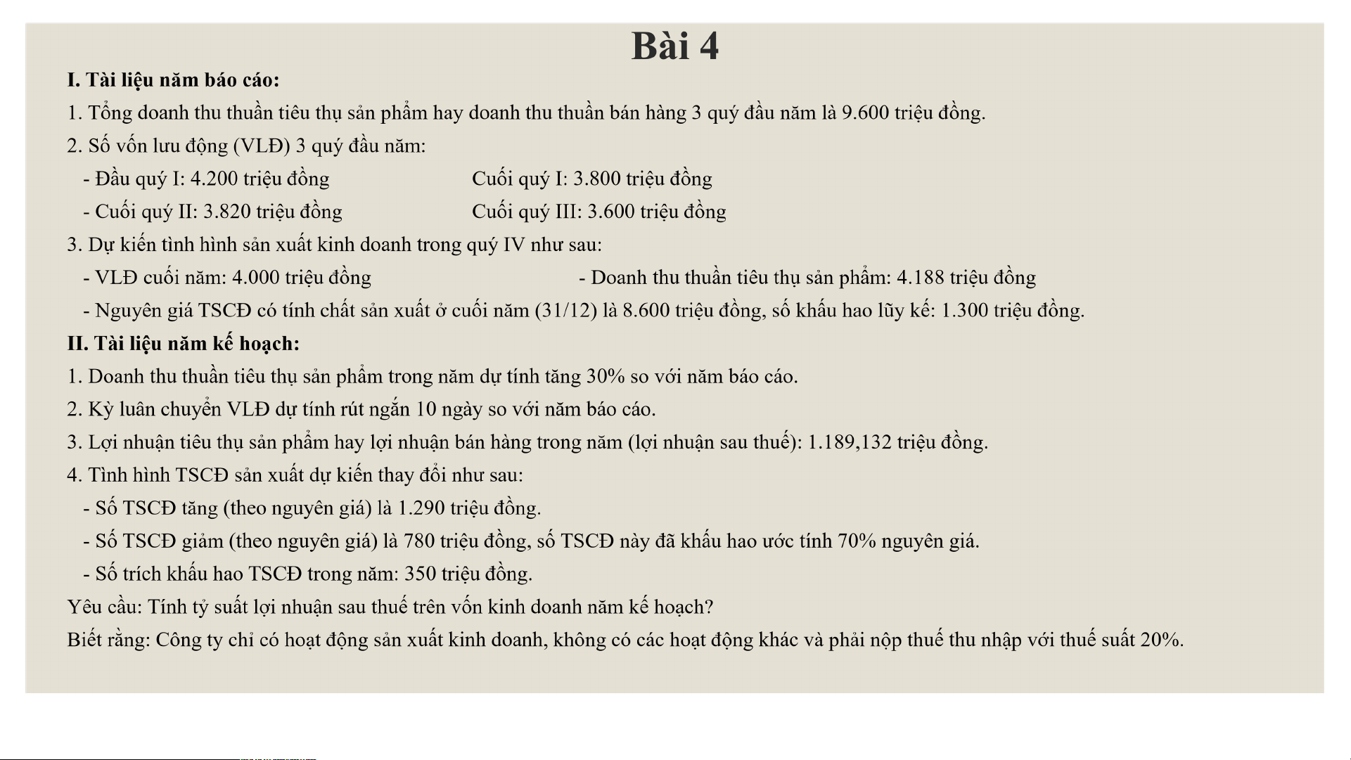 1. Tổng nguyên giá TSCĐ có tính chất sản xuất ở đầu năm là 10.500 triệu đồng. Số
