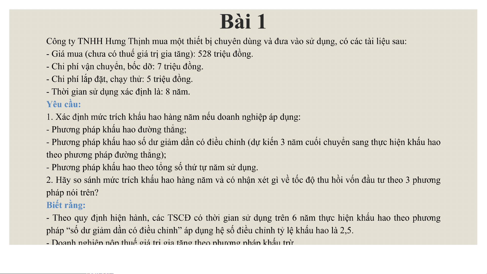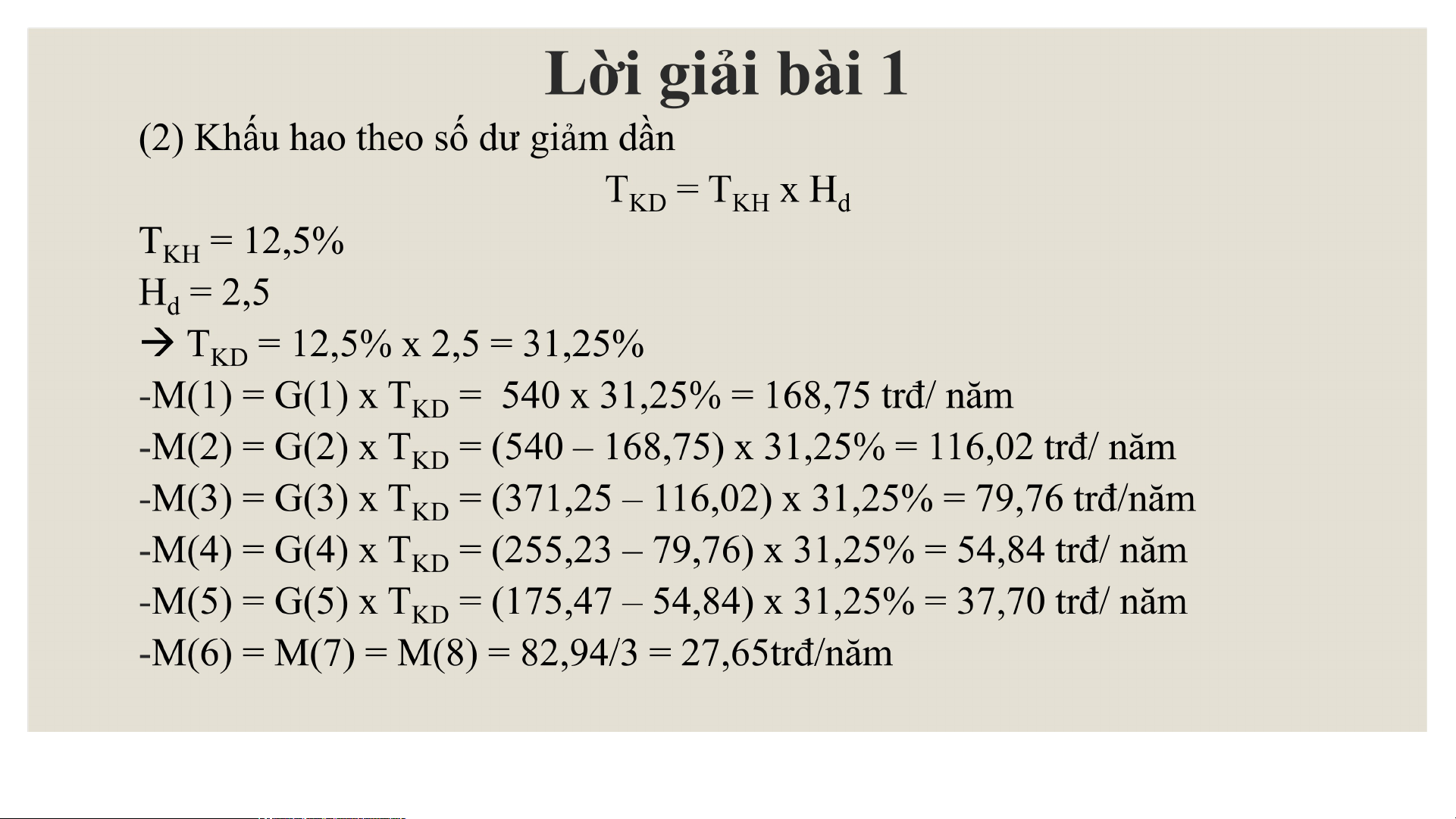 (1) Khấu hao theo phương pháp khấu hao đường thẳng T= 8 TKH = 1/8 x 100% = 12,5%