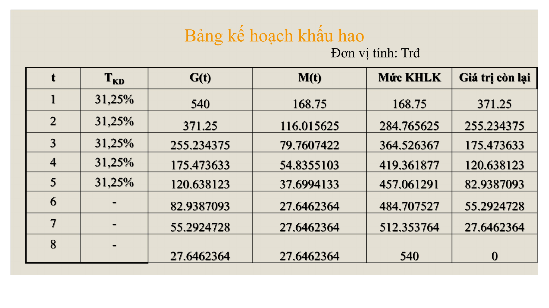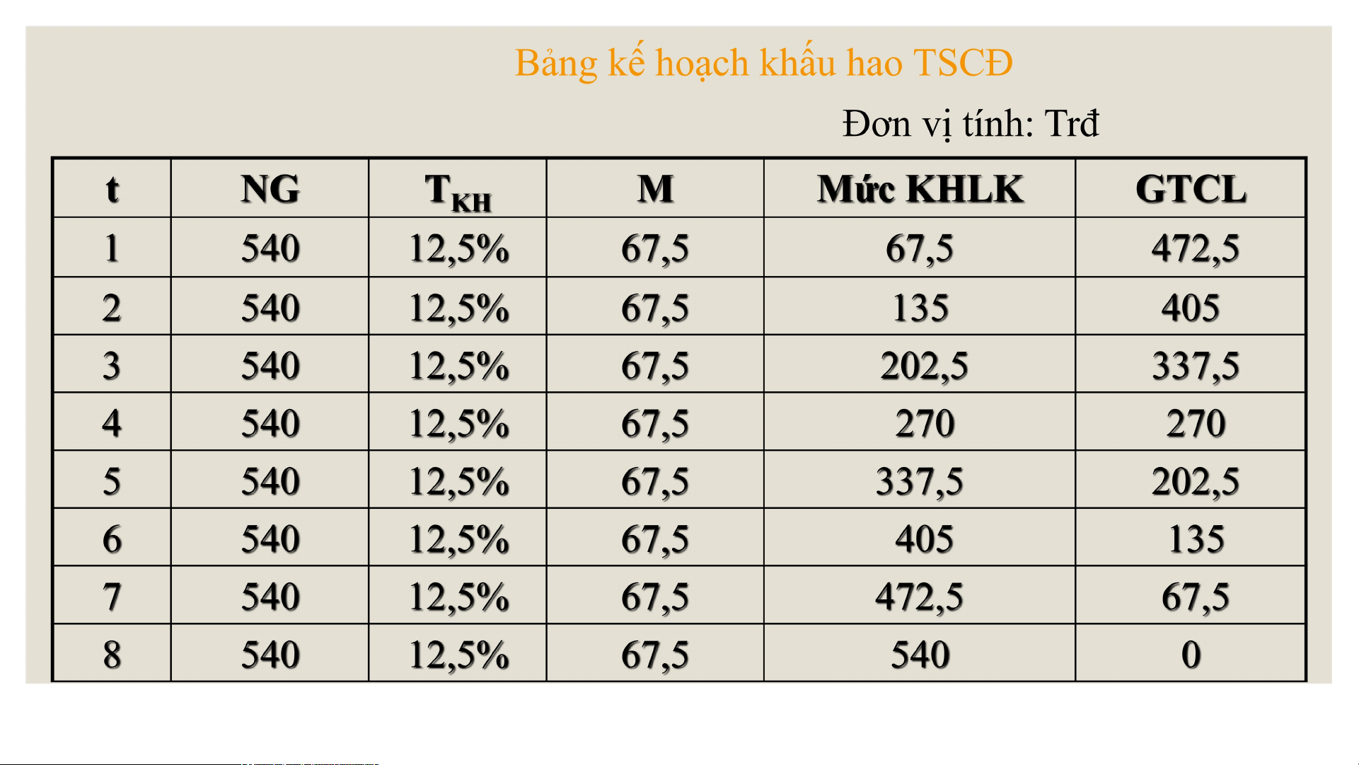 Nguyên giá TSCĐ = 540tr, thời gian sử sụng T =