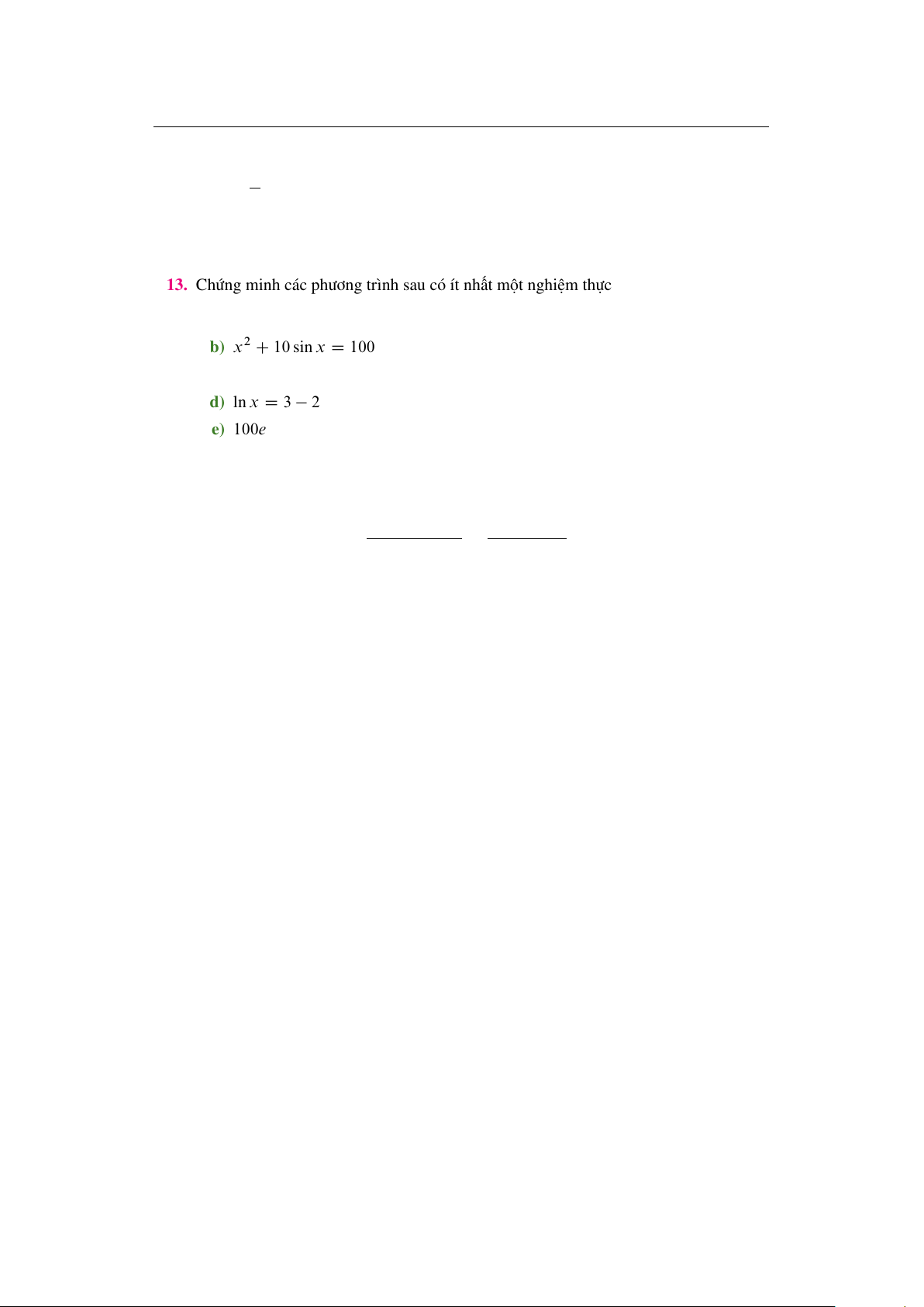 13. Chứng minh các phương trình sau có ít nhất một nghiệm thực a) x3 C 1 D x b) x2 C 10 sin x D 1000 c) cos x D x3 d) ln x D 3 2x e) 100e x=100 D 0:01x2 f) arctan x D 1 x