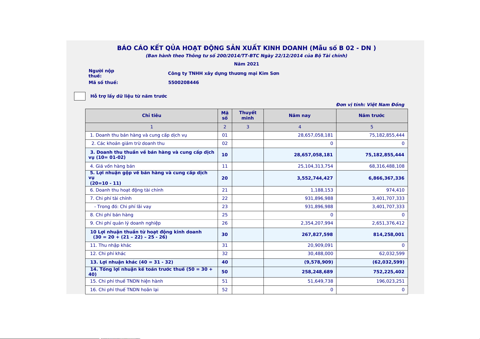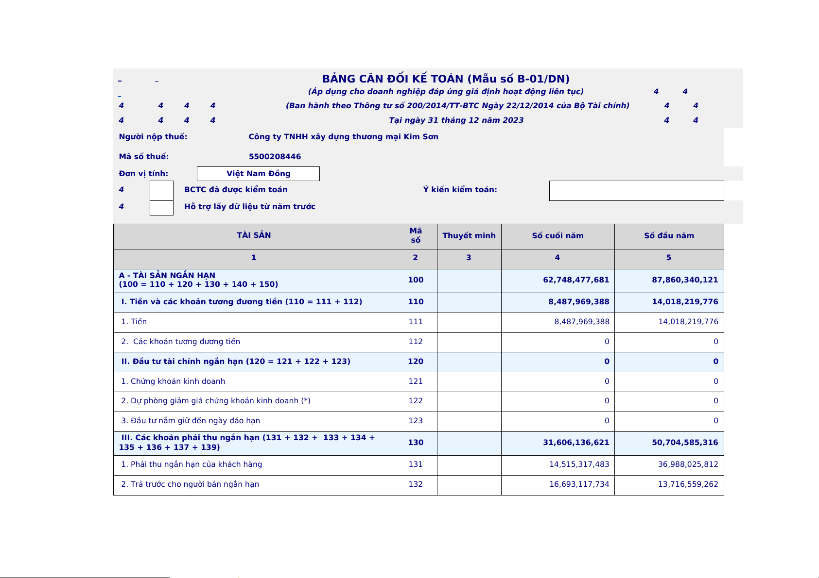 Công ty TNHH xây dựng thương mại Kim Sơn Mã số thuế: 5500208446 Đơn vị tính: Việt Nam Đồng 4