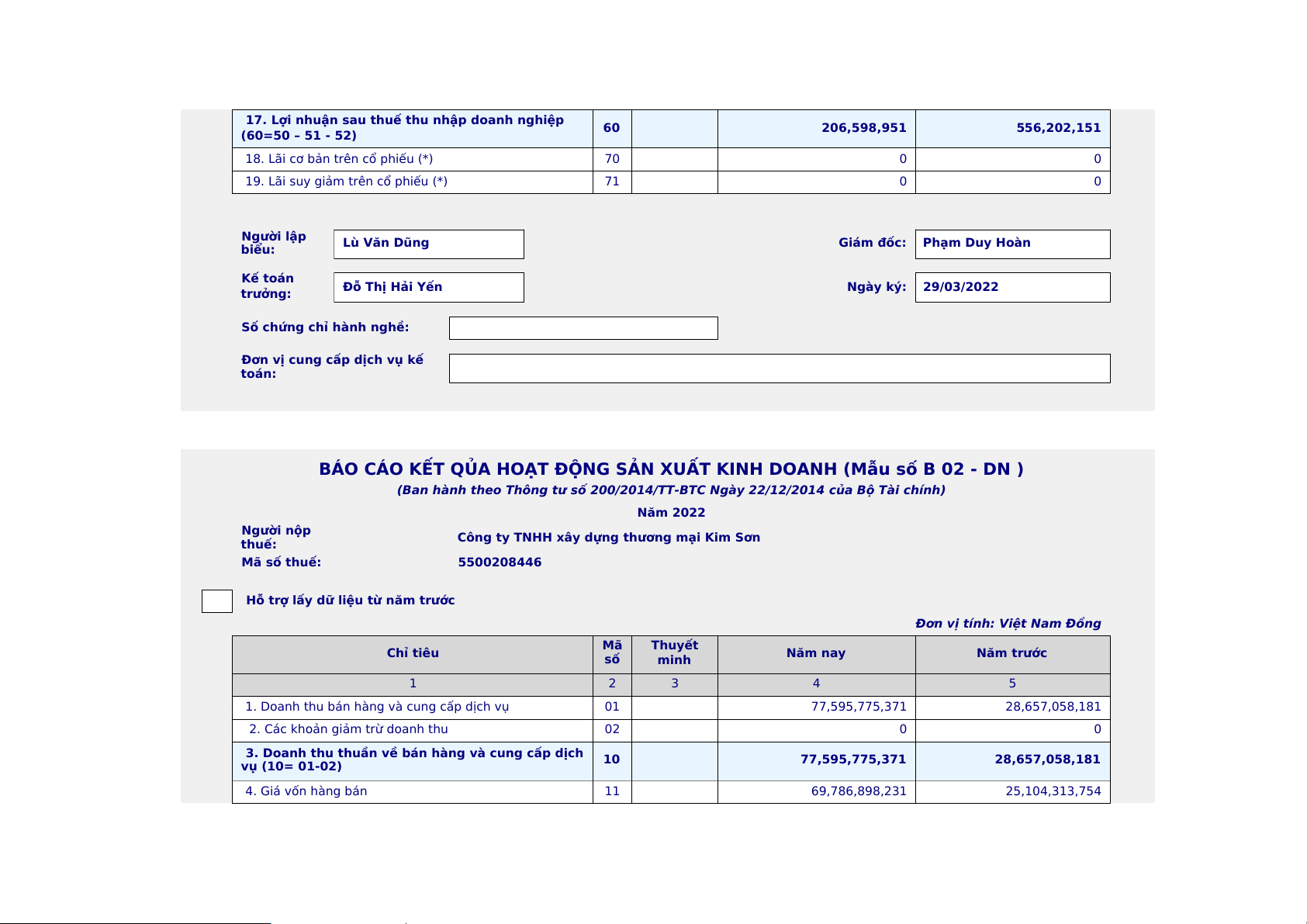 19. Lãi suy giảm trên cổ phiếu (*) 71 0 0 Người lập biểu: Lù Văn Dũng Giám đốc: Phạm Duy Hoàn Kế toán trưởng: Đỗ Thị Hải Yến Ngày ký: 29/03/2022