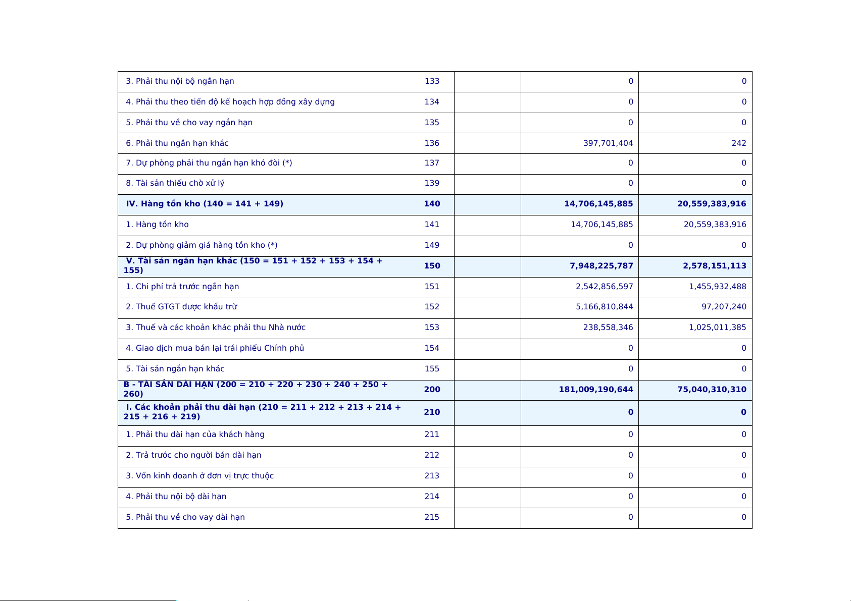 I. Các khoản phải thu dài hạn (210 = 211 + 212 + 213 + 214 + 215 + 216 + 219) 210 0 0