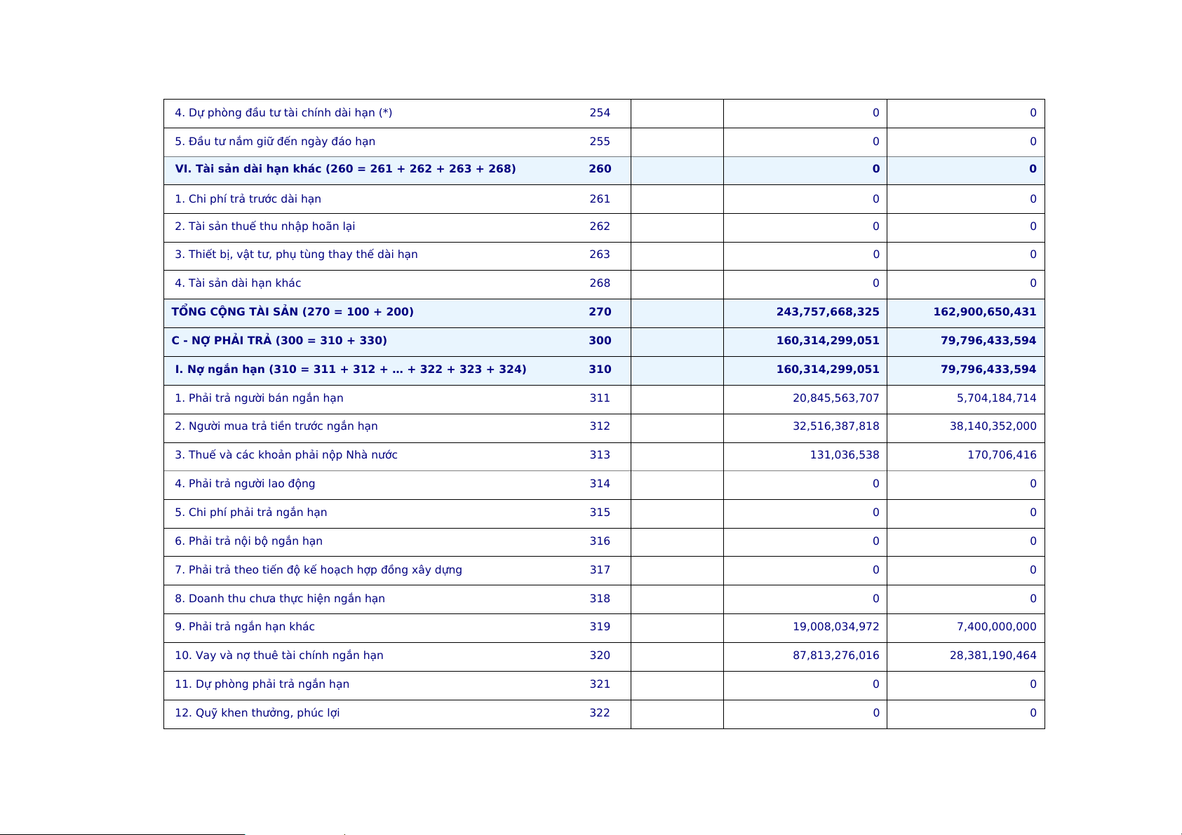 I. Nợ ngắn hạn (310 = 311 + 312 + … + 322 + 323 + 324) 310 160,314,299,051 79,796,433,594
