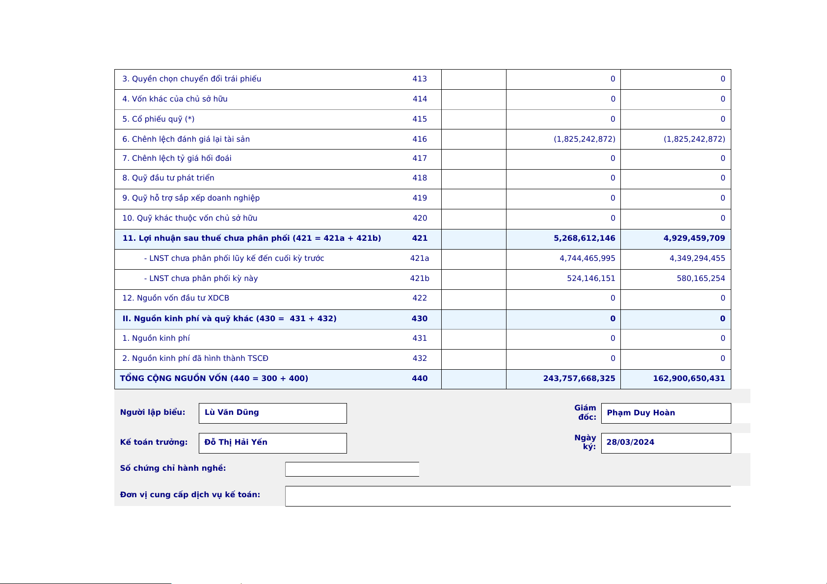 TỔNG CỘNG NGUỒN VỐN (440 = 300 + 400) 440 243,757,668,325 162,900,650,431 Người lập biểu: Lù Văn Dũng Giám đốc: Phạm Duy Hoàn Kế toán trưởng: Đỗ Thị Hải Yến Ngày ký: 28/03/2024