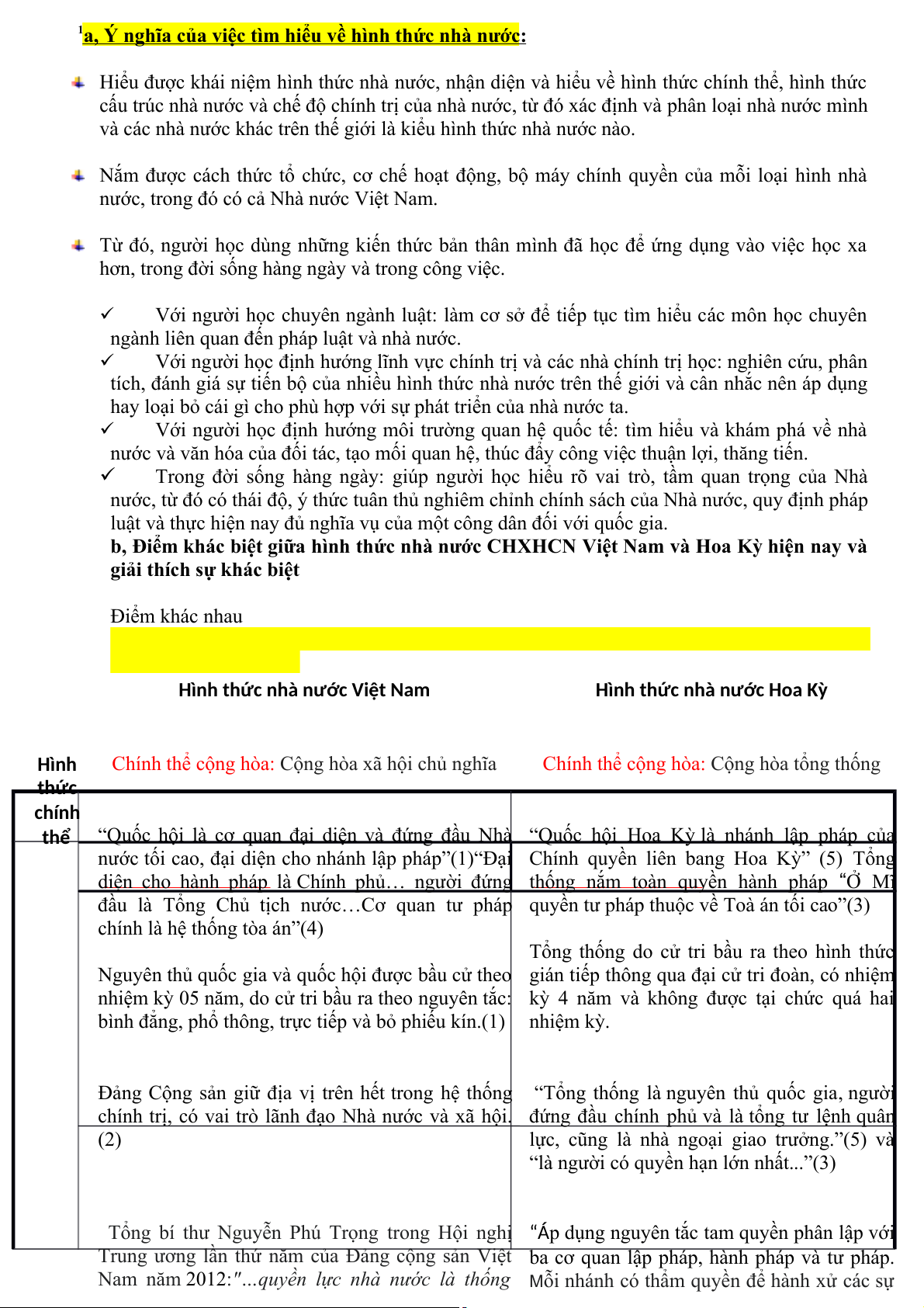b, Điểm khác biệt giữa hình thức nhà nước CHXHCN Việt Nam và Hoa Kỳ hiện nay và