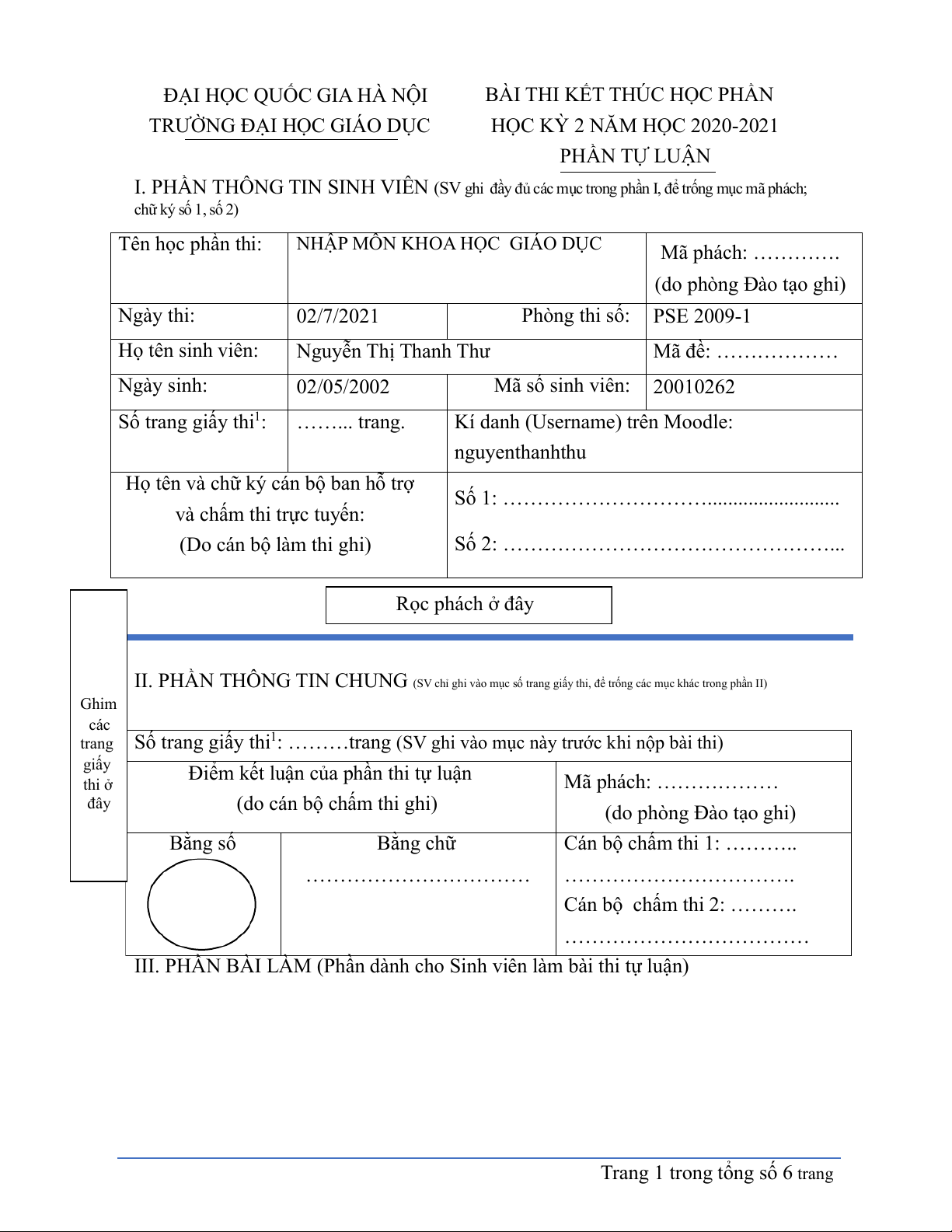 I. PHẦN THÔNG TIN SINH VIÊN (SV ghi đầy đủ các mục trong phần I, để trống mục mã phách; chữ ký số 1, số 2) Tên học phần thi: NHẬP MÔN KHOA HỌC G Á I O DỤC Mã phách: …………. (do phòng Đào tạo ghi) Ngày thi: 02/7/2021 Phòng thi số: PSE 2009-1 Họ tên sinh viên: Nguyễn Thị Thanh Thư Mã đề: ……………… Ngày sinh: 02/05/2002 Mã số sinh viên: 20010262 Số trang giấy thi1: ……... trang.