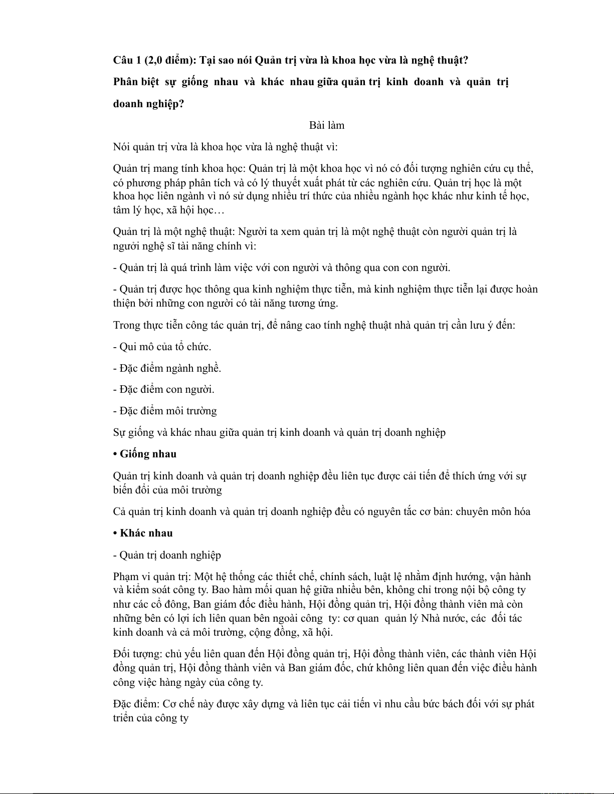 Câu 1 (2,0 điểm): Tại sao nói Quản trị vừa là khoa học vừa là nghệ thuật?