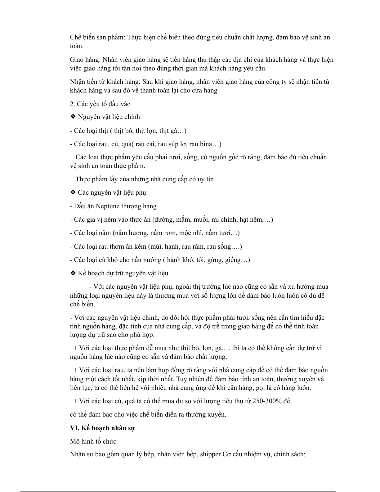 Nhân sự bao gồm quản lý bếp, nhân viên bếp, shipper Cơ cấu nhiệm vụ, chính sách: