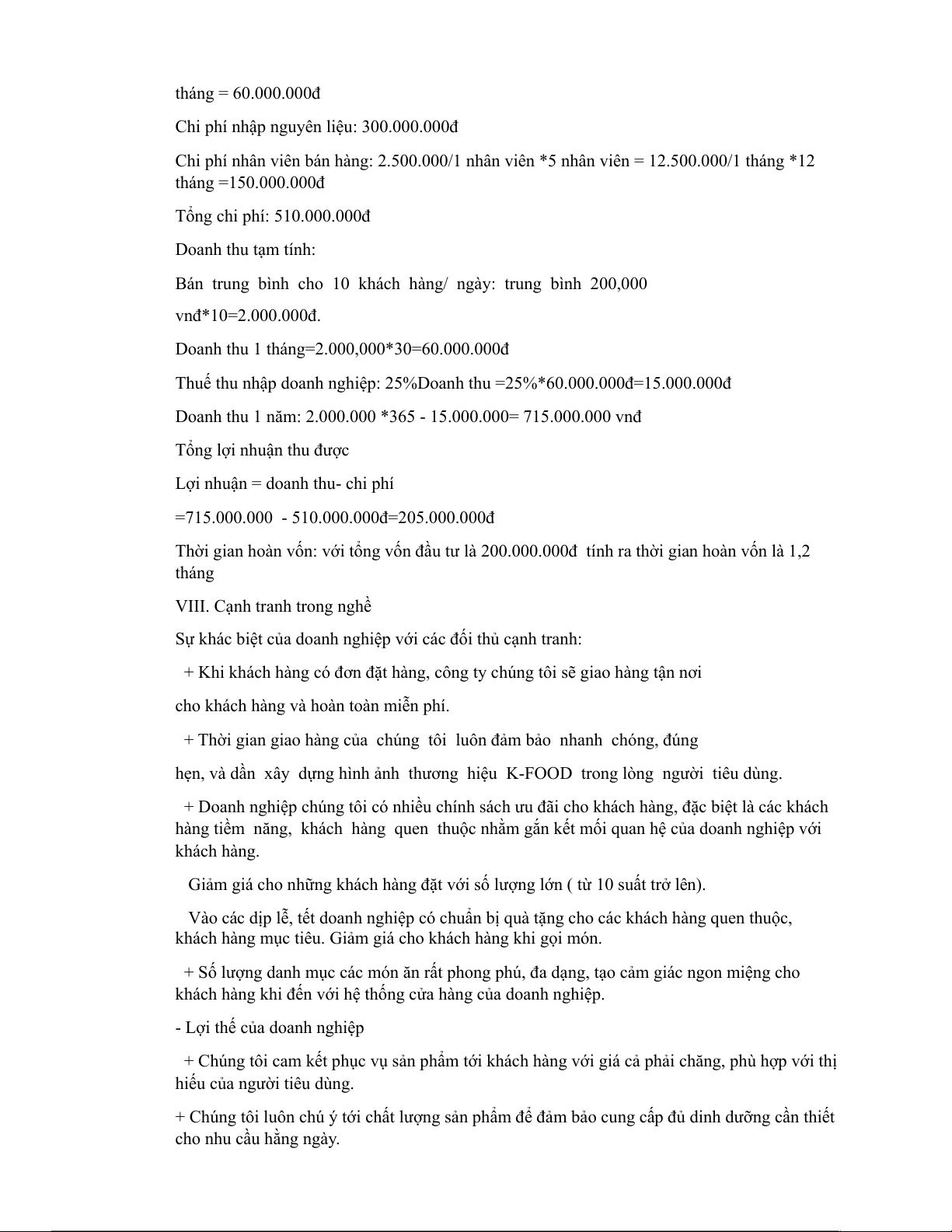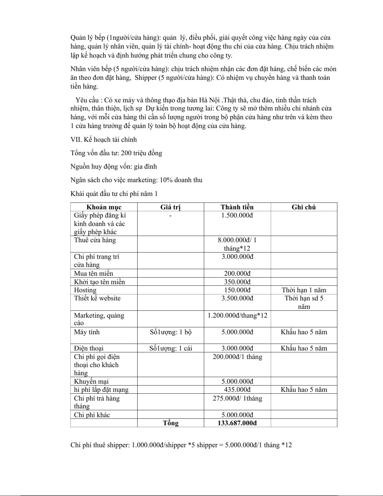 1 cửa hàng trưởng để quản lý toàn bộ hoạt động của cửa hàng. VII. Kế hoạch tài chính