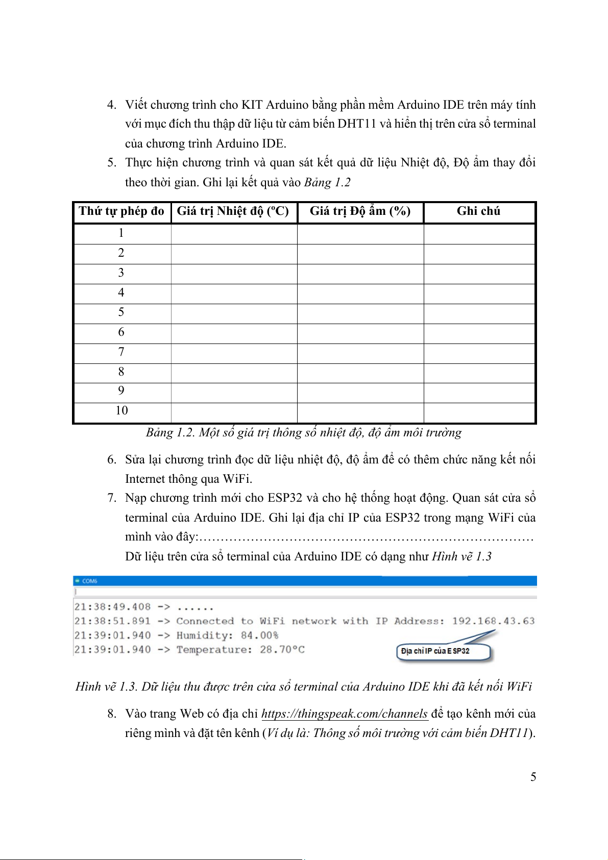 với máy tính qua cổng USB. Bật nguồn điện KIT thí nghiệm IoT. Điền đầy đủ