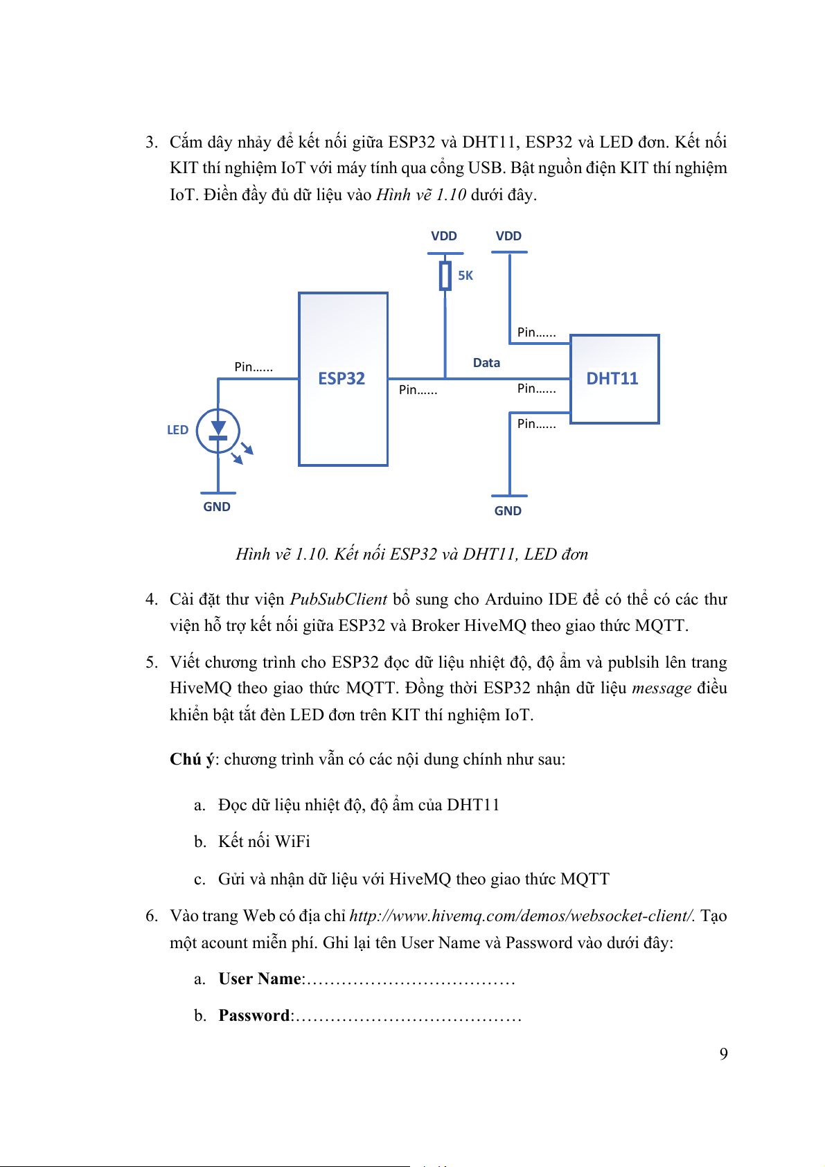IoT. Điền đầy đủ dữ liệu vào Hình vẽ 1.10 dưới đây. VDD VDD 5K Pin…... Data Pin…... ESP32 DHT11 Pin…... Pin…... LED Pin…... GND GND