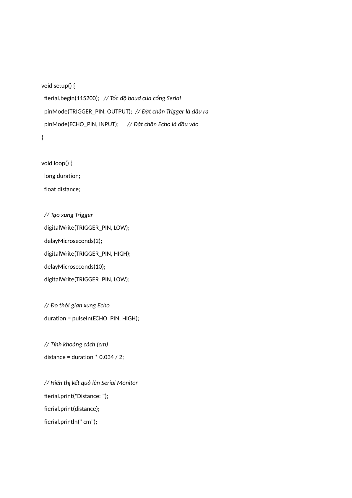 // Hiển thị kết quả lên Serial Monitor Serial.print("Distance: "); Serial.print(distance); Serial.println(" cm");