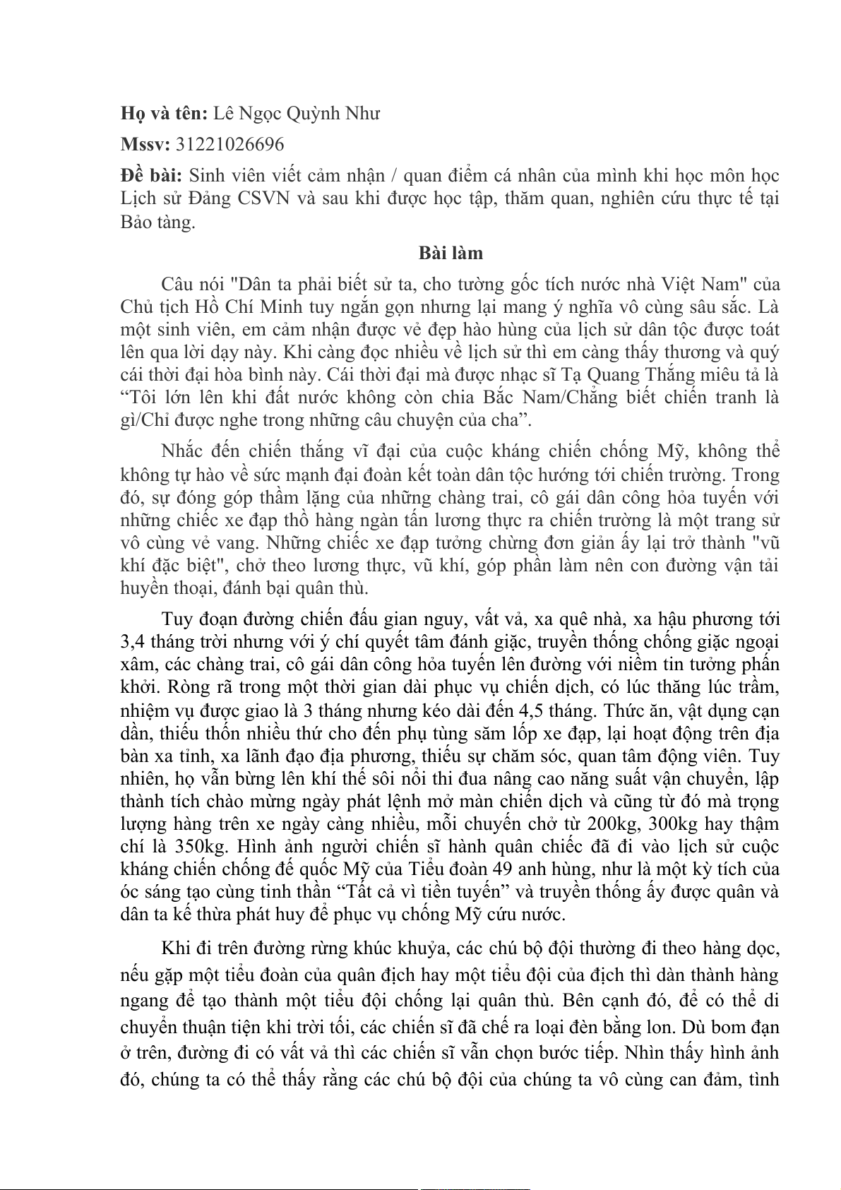 Lịch sử Đảng CSVN và sau khi được học tập, thăm quan, nghiên cứu thực tế tại Bảo tàng. Bài làm