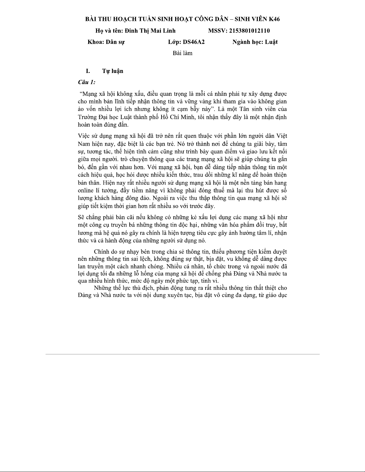 BÀI THU HOẠCH TUẦN SINH HOẠT CÔNG DÂN - LUẬT DS46A2