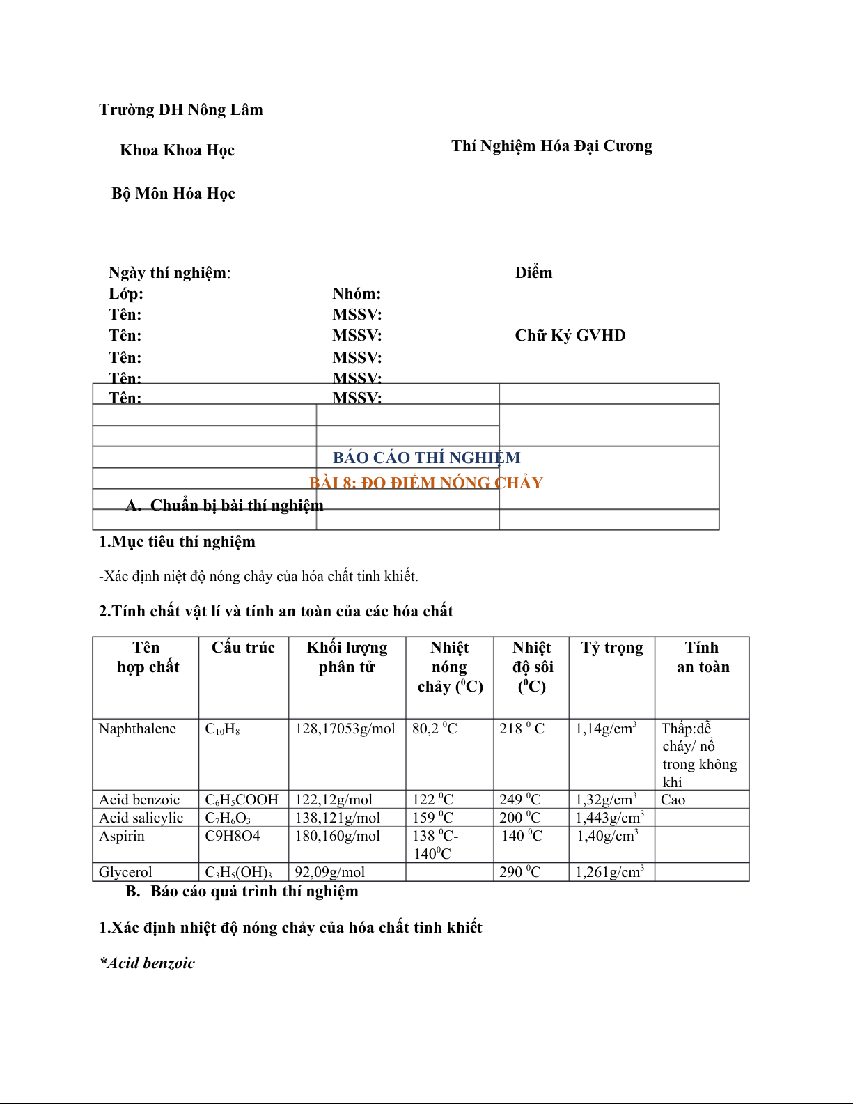 1.Xác định nhiệt độ nóng chảy của hóa chất tinh khiết *Acid benzoic