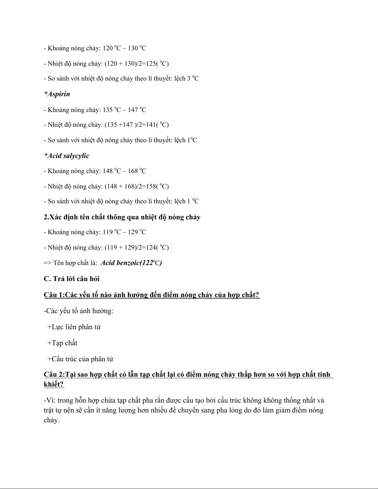- So sánh với nhiệt độ nóng chảy theo lí thuyết: lệch 10C *Acid salycylic