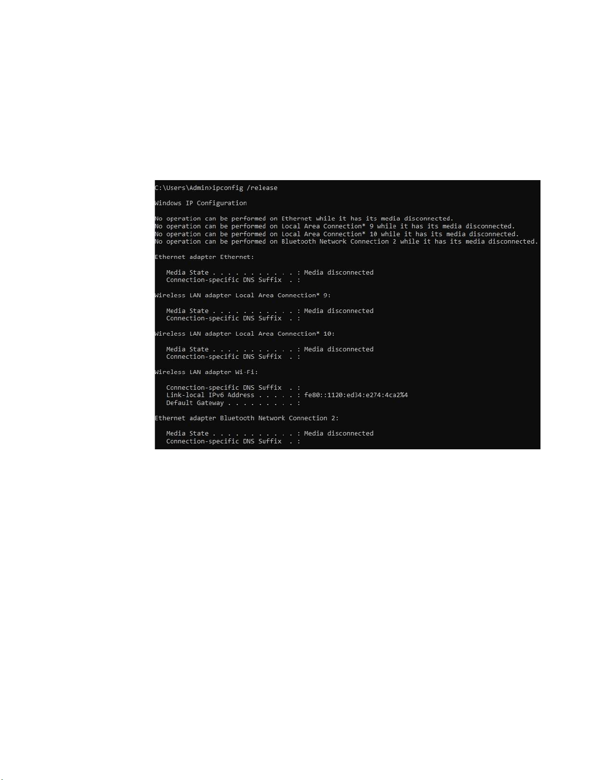 Kết quả trên cho thấy rằng lệnh ipconfig /release không thể thực hiện trên một số