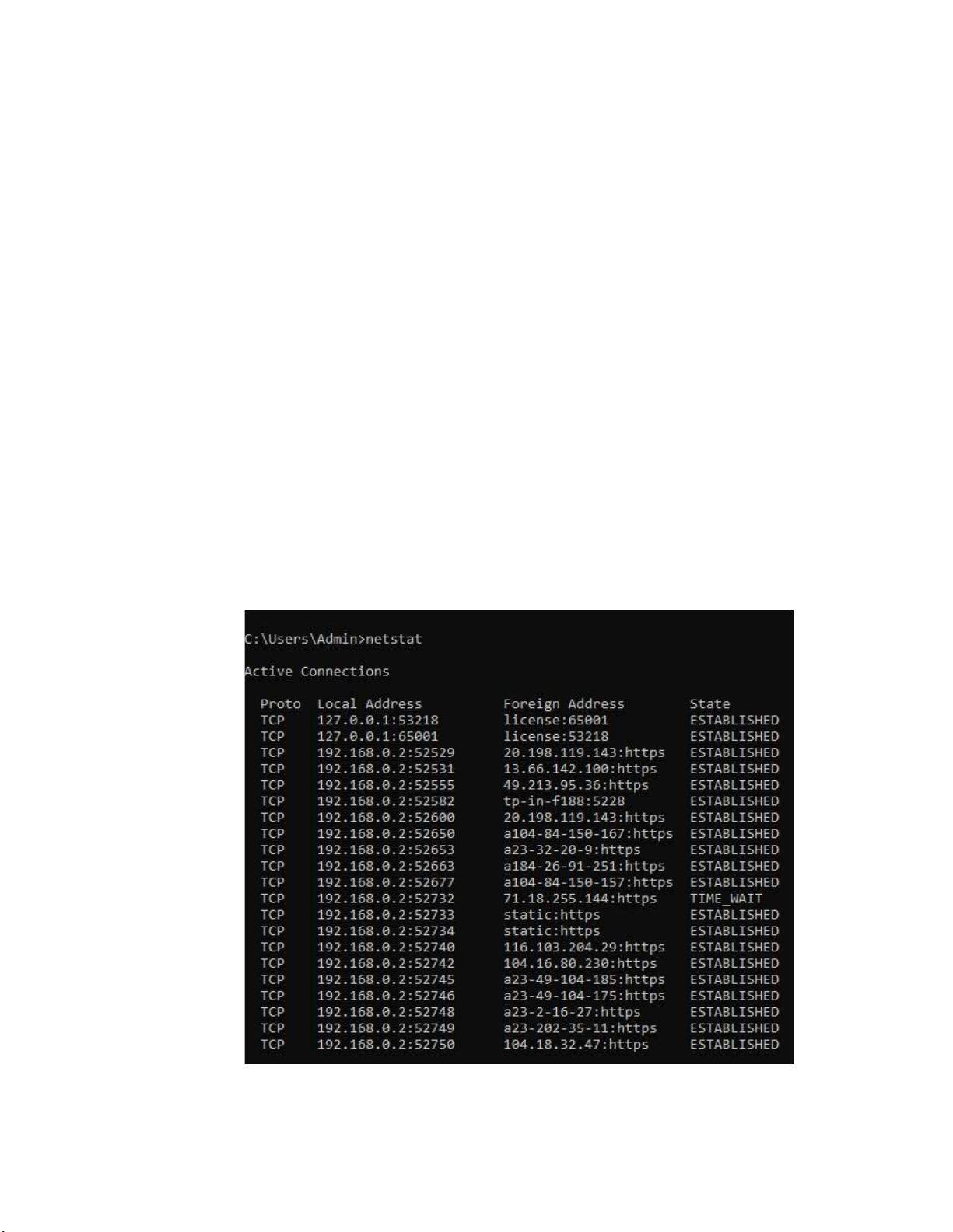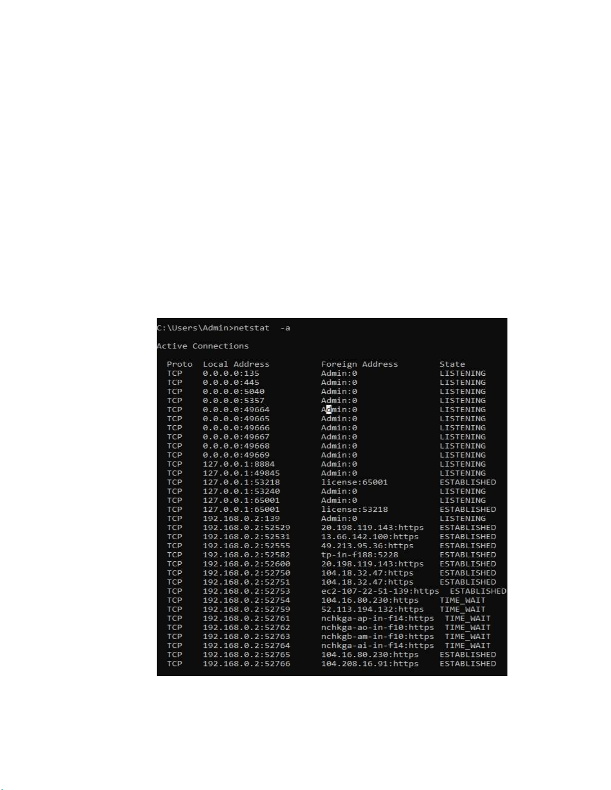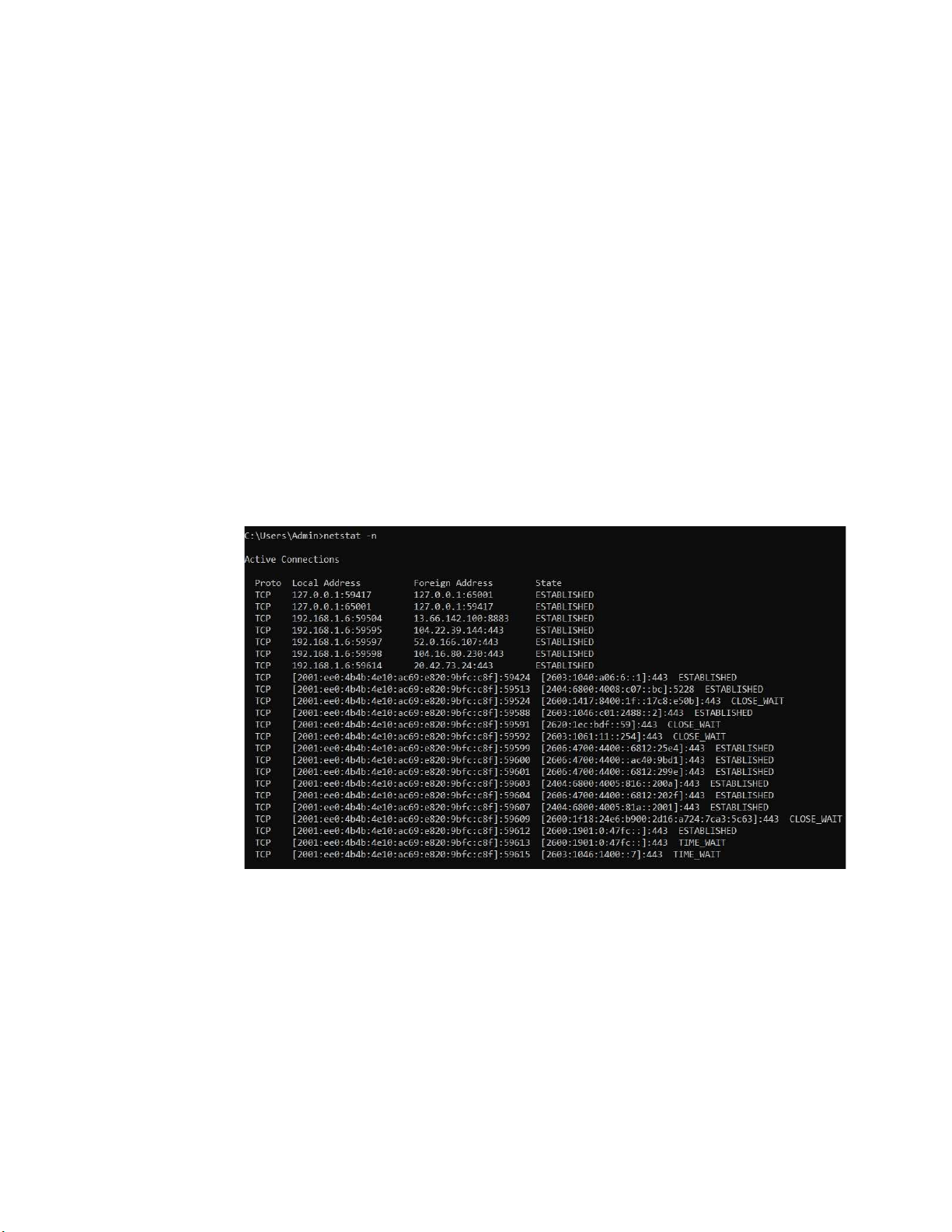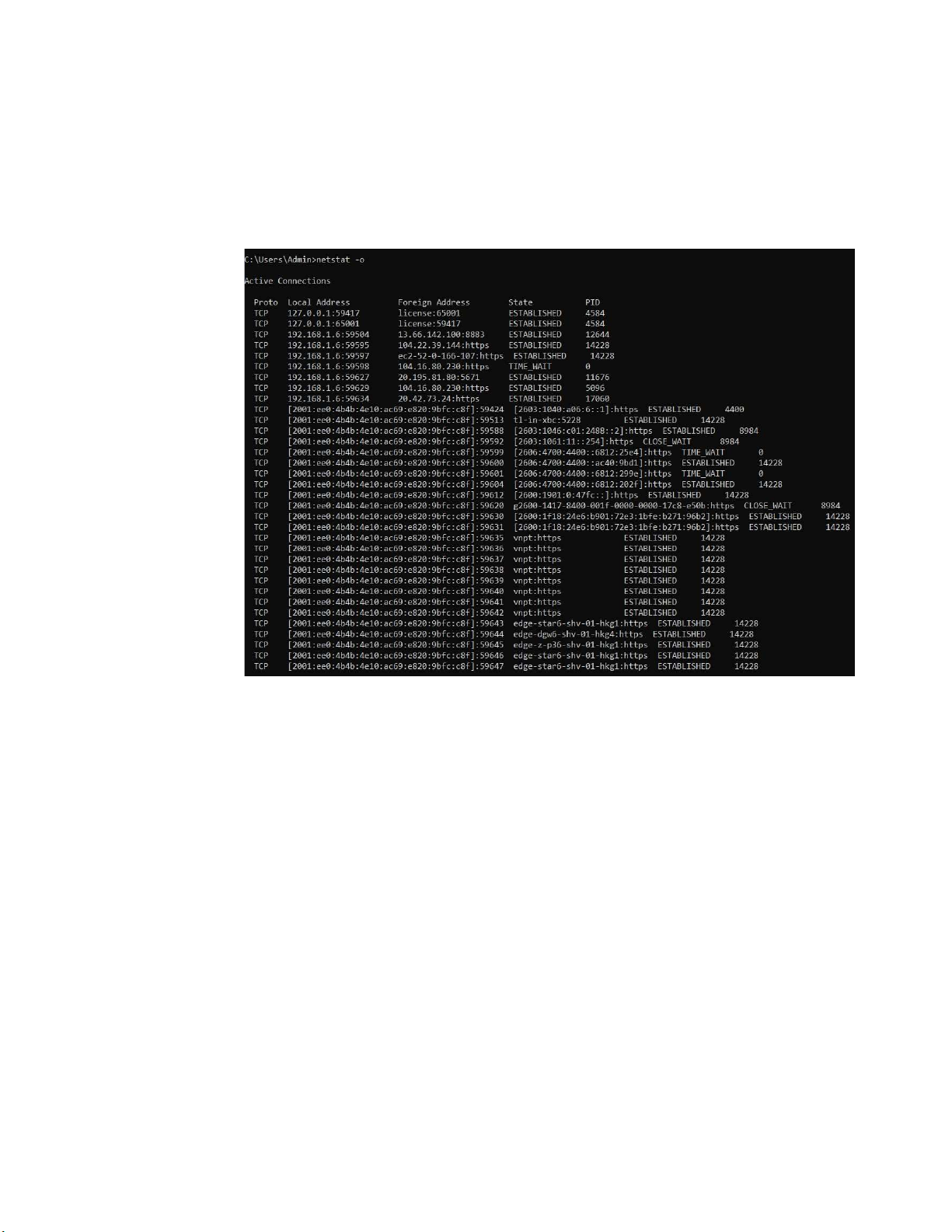 Các kết nối 127.0.0.1 là kết nối cục bộ (loopback), thường dùng cho ứng dụng chạy trên máy của bạn. lOMoARcP SD| 58886076 Lệnh netstat -o