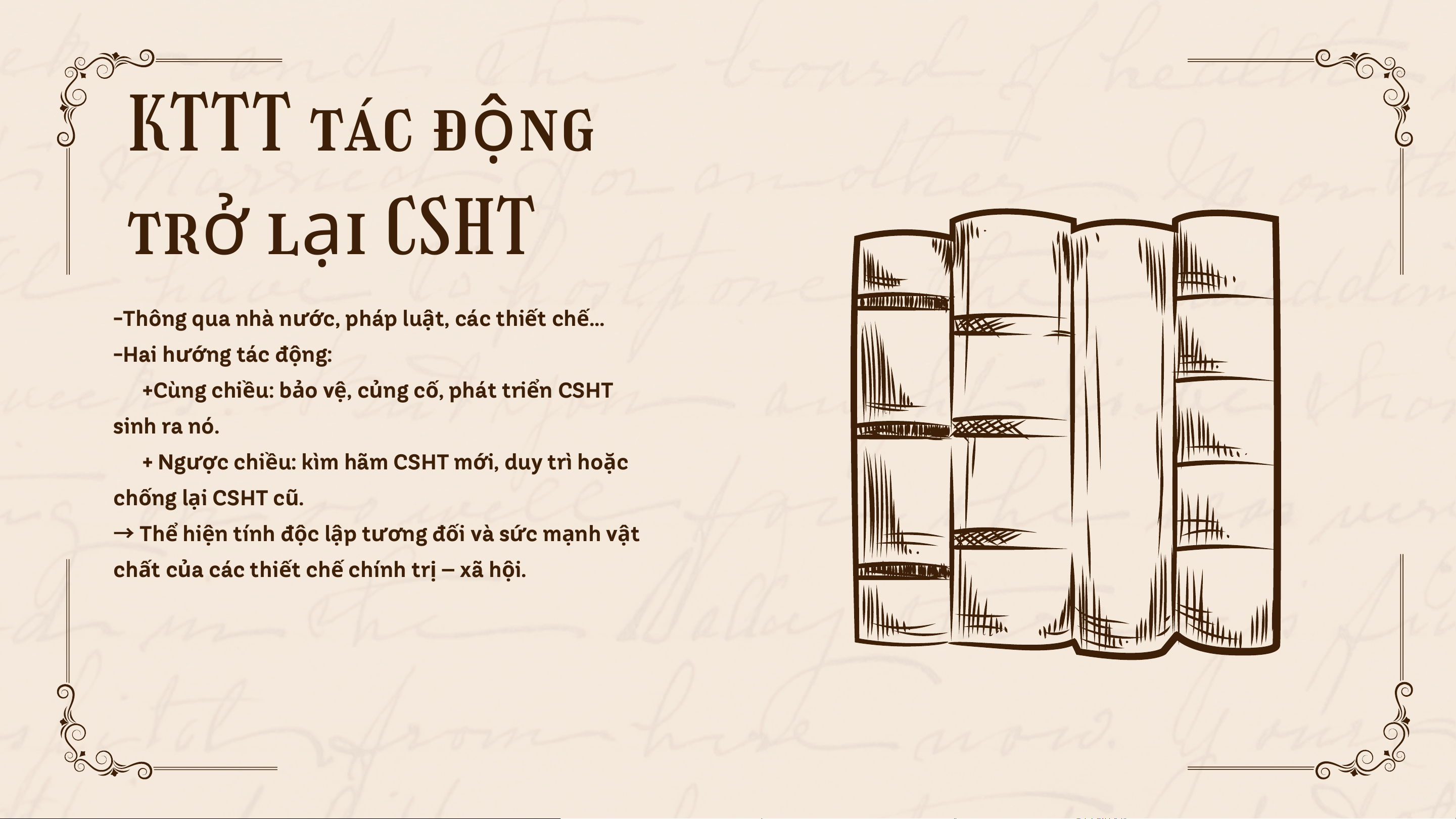 + CSHT nào → KTTT đó (kinh tế quyết định chính trị, pháp luật, tư tưởng).