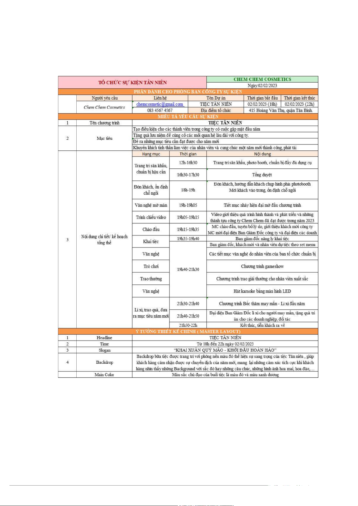 2.2.2 Timeline chi tiết Hạng Thời Nội dung Chi tiết Nhân sự Dụng cụ mục gian Trang trí Tiến hành Bộ phận Dụng cụ sân khấu, trang trí sân thiết kế, trang trí, bàn ghế, khấu, bàn nhân lắp đặt, 2/2/2023: photobooth, ghế, viên hậu chuẩn bị Trang trí 12h chuẩn bị photobooth, cần, lắp phần sân khấu, - đầy đủ kiểm tra kĩ đặt, kĩ thưởng, chuẩn bị 16h30p dụng cụ, thuật thuật chuẩn bị hậu cần phần thùng (5,5 giờ ) thưởng đựng phiếu thăm 12 Tổng duyệt Kiểm tra Giám sát Âm âm thanh, chương thanh, ánh sáng, trình, ánh sáng, backdrop, MC, PG backdrop photobooth, chính 16h30p kiểm tra về - ẩm thực, 17h30p hướng dẫn chi tiết cho MC và PG những việc cần làm Đón khách, Ban lãnh 2 PG, 3 Backdrop hướng dẫn đạo công ty đội ngũ chụp hình, khách chụp Chem nhân photobooth hình phía Chem viên Đón bên ngoài Cosmetics chụp ảnh khách, 18h đón và cho ổn định - chụp hình khách chỗ ngồi 19h chung với của ban (1 giờ ) khách, PG tổ chức, hướng dẫn Ban lãnh khách chụp đạo công ở backdrop ty 13 Mời khách PG kiểm 2 PG, Âm nhạc, vào trong, tra thư mời Ban backdrop ổn định chỗ của các Giám chính, ngồi, đối khách mời Đốc thùng với nhân tại cửa đựng viên công phòng tiệc, phiếu ty thì sẽ cho nhân thăm được bốc viên Chem thăm có Chem đánh số Cosmetics trong thùng bốc thăm phiếu thăm và hướng để tham gia dẫn khách bốc thăm vào chỗ trúng ngồi đã thưởng được sắp xếp Tiết mục MC, Vũ Âm nhảy hiện đoàn bước nhạc, đại đến từ nhảy ánh Văn nghệ 19h Vũ đoàn sáng, thứ nhất - bước nhảy backdrop (5 phút) 19h05p mở đầu chính chương trình 14 Video giới Nhân viên Màn thiệu về kỹ thuật hình công ty của ban tổ LED, âm Chem chức thanh Chem Cosmetics, Trình quá trình 19h05p chiếu hình thành, - video phát triển 19h15p (10 Phút) và những thành tựu công ty đã đạt được trong năm 2023 MC chào MC Âm đầu, tuyên thanh, 19h15p Mở màn bố lý do, ánh - (20 phút) giới thiệu sáng, 19h20p khách mời backdrop công ty chính 15 MC mời MC, đại Âm đại diện diện Ban thanh, Ban Giám Giám Đốc, ánh Đốc công đại diện sáng, ty Chem khách mời, backdrop Chem đối tác của chính, 19h20p Cosmetics công ty màn - và đại diện Chem hình 19h35p các doanh Chem LED nghiệp hợp Cosmetics tác phát biểu, đưa ra mục tiêu cho năm mới Ban giám Đại diện Âm đốc nâng ly Ban Giám thanh, Khai tiệc 19h35p khai tiệc Đốc ánh (1 giờ 55 - sáng, phút) 19h40p backdrop chính 16 Toàn thể Ban Giám Âm ban giám Đốc, nhân nhạc, đốc, khách viên nhà ánh sáng mời và hàng, 19h40p nhân viên khách mời, - công ty đối tác 21h30p Chem Chem Cosmetics dự tiệc theo set menu Tiết mục Minh Thư, Âm hát song ca Thu nhạc, Văn nghệ 19h55p của Minh Phương, ánh thứ hai - Thư và Thu MC sáng, (5 phút) 20h Phương backdrop đến từ ban chính tổ chức 17 Gameshow MC, nhân Âm “Giải ô viên công thanh, chữ” ty Chem ánh Chem sáng, Cosmetics, backdrop khách mời, chính, 20h đối tác màn Trò chơi - hình (20 phút) 20h20p LED, đạo cụ, phần thưởng cho đội chiến thắng Hát MC, nhân Màn karaoke viên công hình Văn nghệ 20h20p bằng màn ty Chem LED, âm thứ ba - hình LED Chem thanh (1 giờ) 21h20p Cosmetics, khách mời, đối tác Vinh danh Đại diện Âm và trao giải Ban Giám nhạc, thưởng cho Đốc, MC, ánh 21h20p Trao thưởng nhân viên PG mang sáng, - (10 phút) xuất sắc quà lên sân backdrop 21h30p trong năm khấu chính, vừa qua phần thưởng 18 Chương MC, đại Âm Chương trình Bốc diện Ban nhạc, trình “Bốc thăm may Giám Đốc, ánh thăm may 21h30p mắn - Lì xì nhân viên sáng, mắn - Lì xì - trao tay công ty backdrop trao tay”, 21h40p Chem chính, tặng quà Chem vòng tri ân Cosmetics banh (20 phút) quay số Đại diện Đại diện Âm Ban Giám Ban Giám thanh, Đốc lì xì Đốc, đại ánh cho người diện khách sáng, 21h40p may mắn, mời, đối backdrop - cảm ơn và tác, MC, 1 chính, 21h50p tặng quà tri PG hỗ trợ quà cho ân cho đối mang quà đối tác tác lên sân khấu Kết thúc, Ban Giám Âm nhạc 21h50p tiễn khách, Đốc, MC, Bế mạc - tặng quà PG 22h cho khách