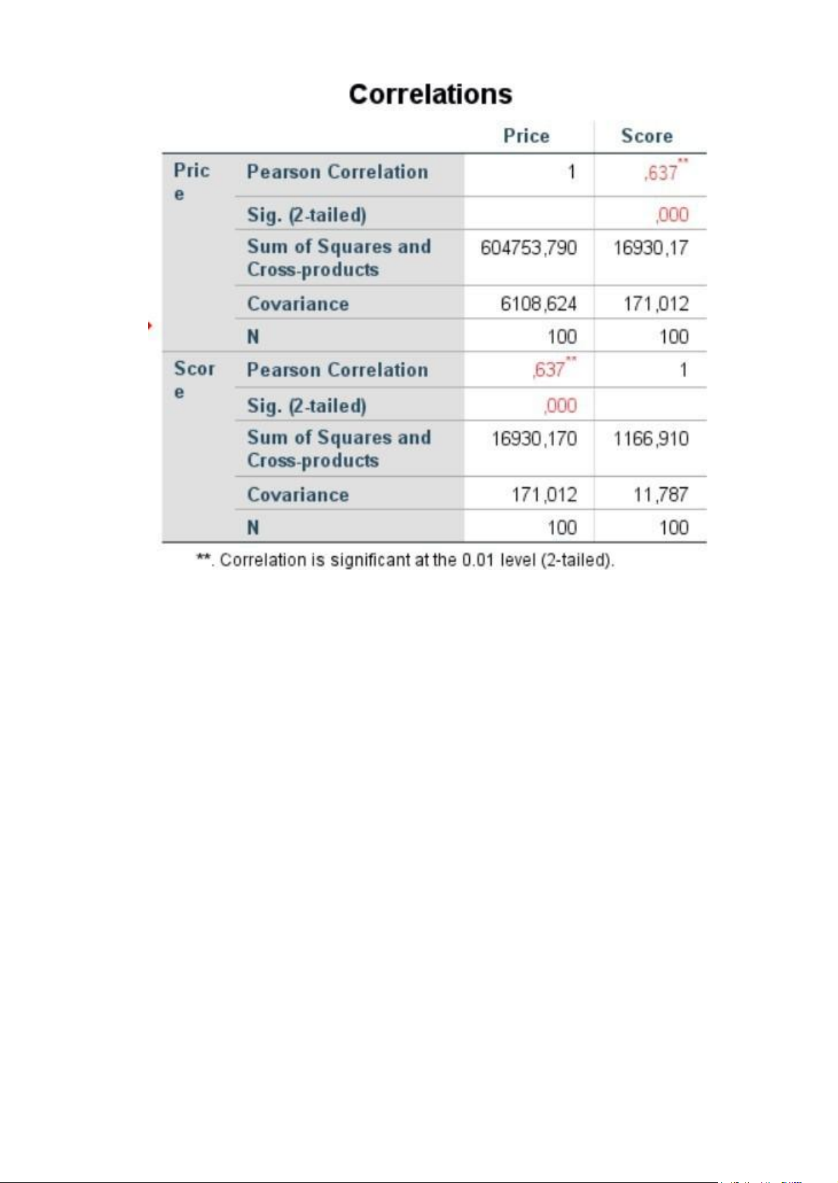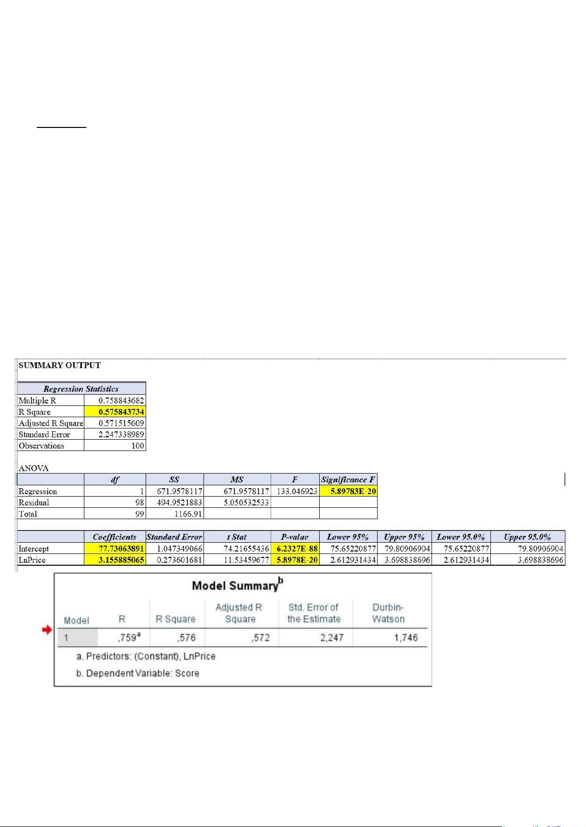 Phương trình hồi quy R Square /Adjus ted square Score = 87.763 + 0.028*Price 0.4062