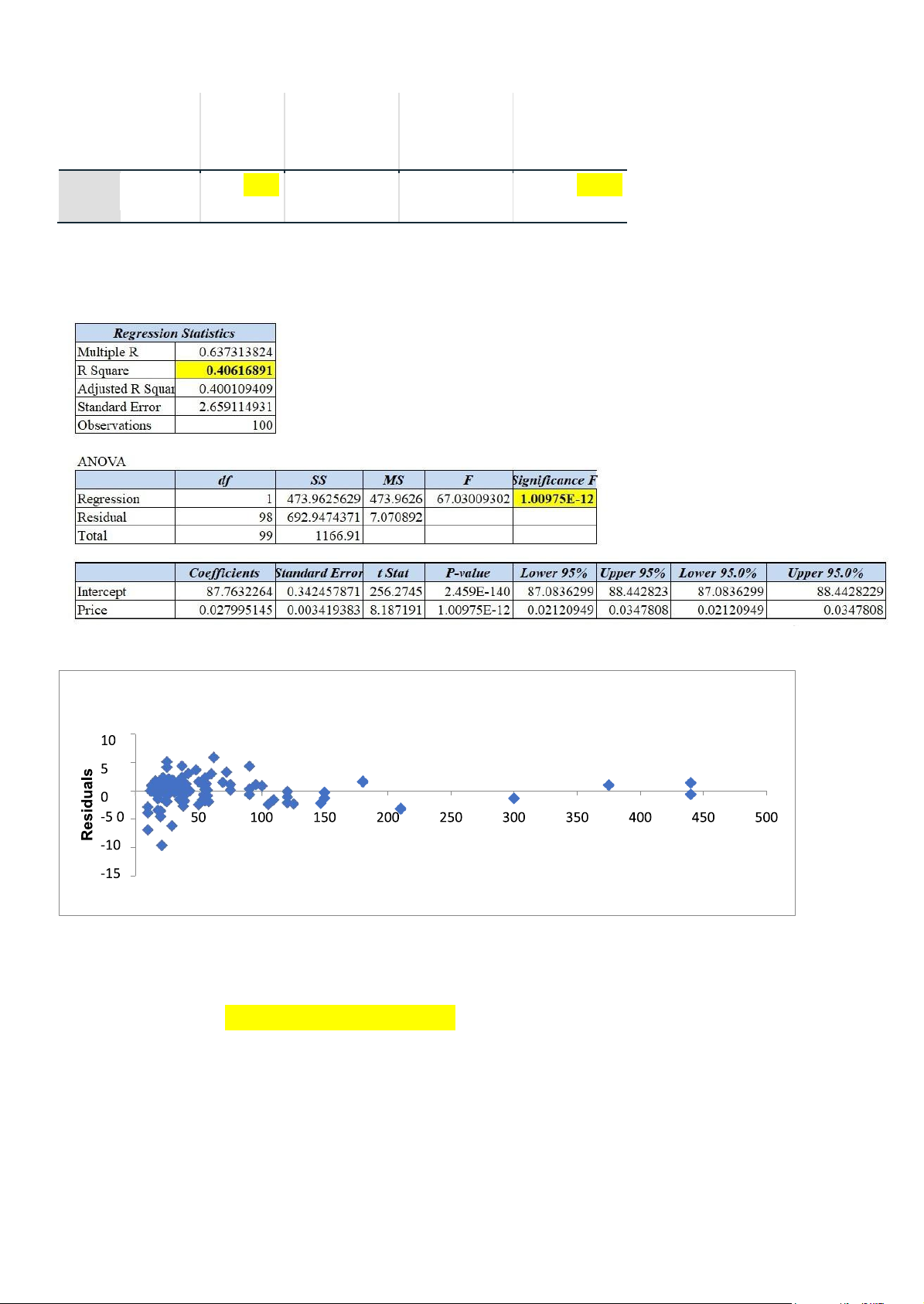 a. Predictors: (Constant), Price b. Dependent Variable: Score Price Residual Plot Price Từ bảng ta có: b0 = 87.763 b1 = 0.028 Vậy PTHQ là: