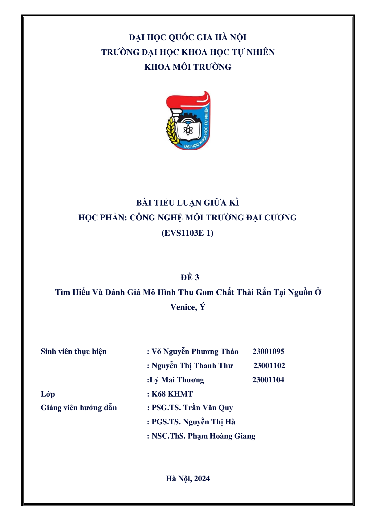 HỌC PHẦN: CÔNG NGHỆ MÔI TRƯỜNG ĐẠI CƯƠNG (EVS1103E 1) ĐỀ 3