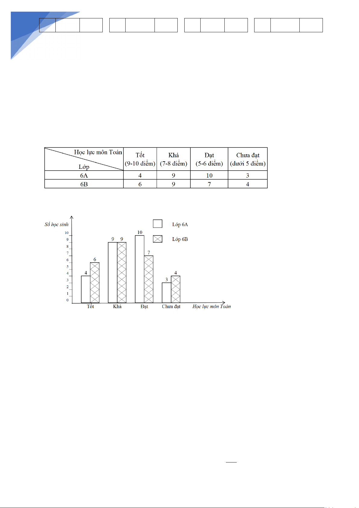 Bài 2: Điểm kiểm tra giữa kỳ môn Toán của lớp 6 A và lớp 6 B như sau: Lớp 6A Lớp 6B TT Tên Điểm TT Tên Điểm TT Tên Điểm TT Tên Điểm 1 An 8 14 Hải 8 1 An 9 14 Hiếu 9 2 Anh 9 15 Hạnh 6 2 Bách 7 15 Huy 6 3 Ánh 6 16 Nam 7 3 Ban 5 16 Hùng 8 4 Bình 8 17 Minh 5 4 Cúc 9 17 Mạnh 4 5 Châu 4 18 Oanh 9 5 Cầm 5 18 Mận 8 6 Cảnh 5 19 Phong 6 6 Chân 4 19 Pha 8 7 Dung 9 20 Phú 8 7 Dân 8 20 Phú 7 8 Dũng 7