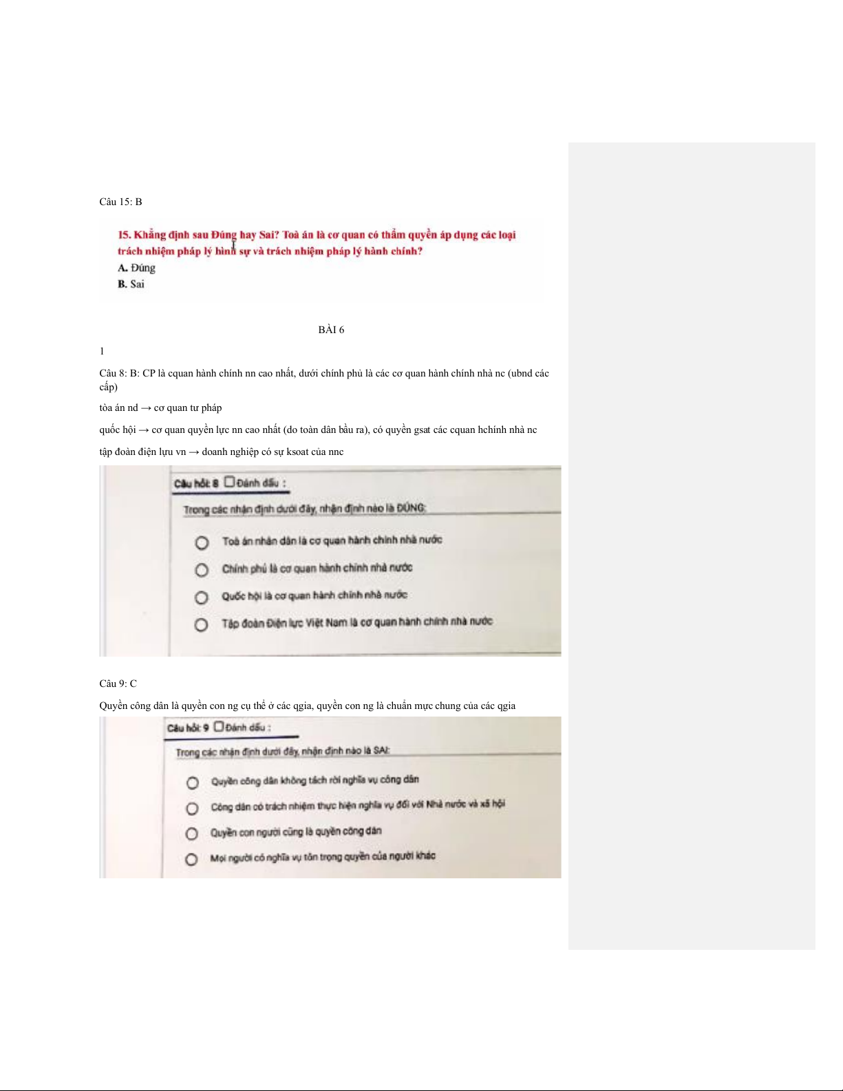 Câu 14: B → đánh người thương dưới 11% là hành chính, trên 11% là hình sự → ko thể truy cứu cùng lúc Câu 15: B BÀI 6 1