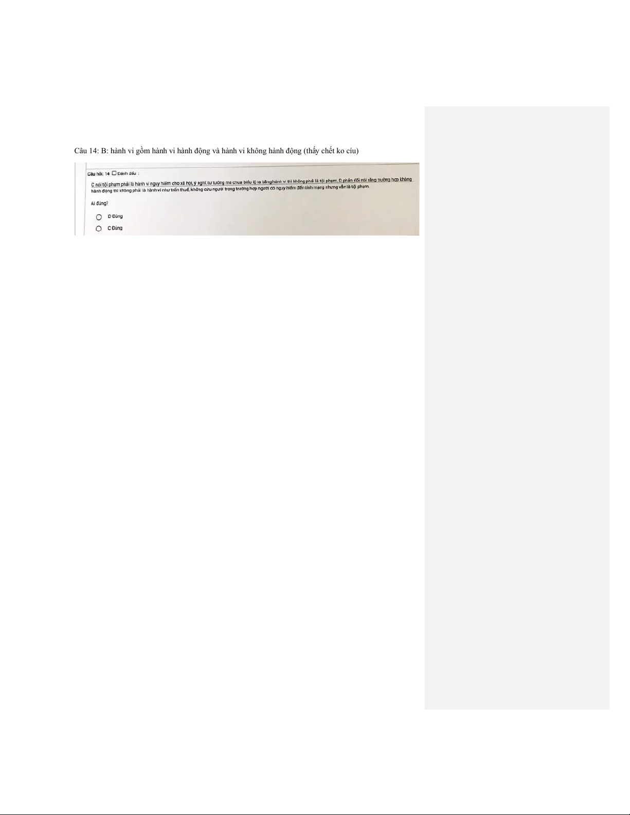 Câu 14: B: hành vi gồm hành vi hành động và hành vi không hành độn g (thấy chết ko cíu)