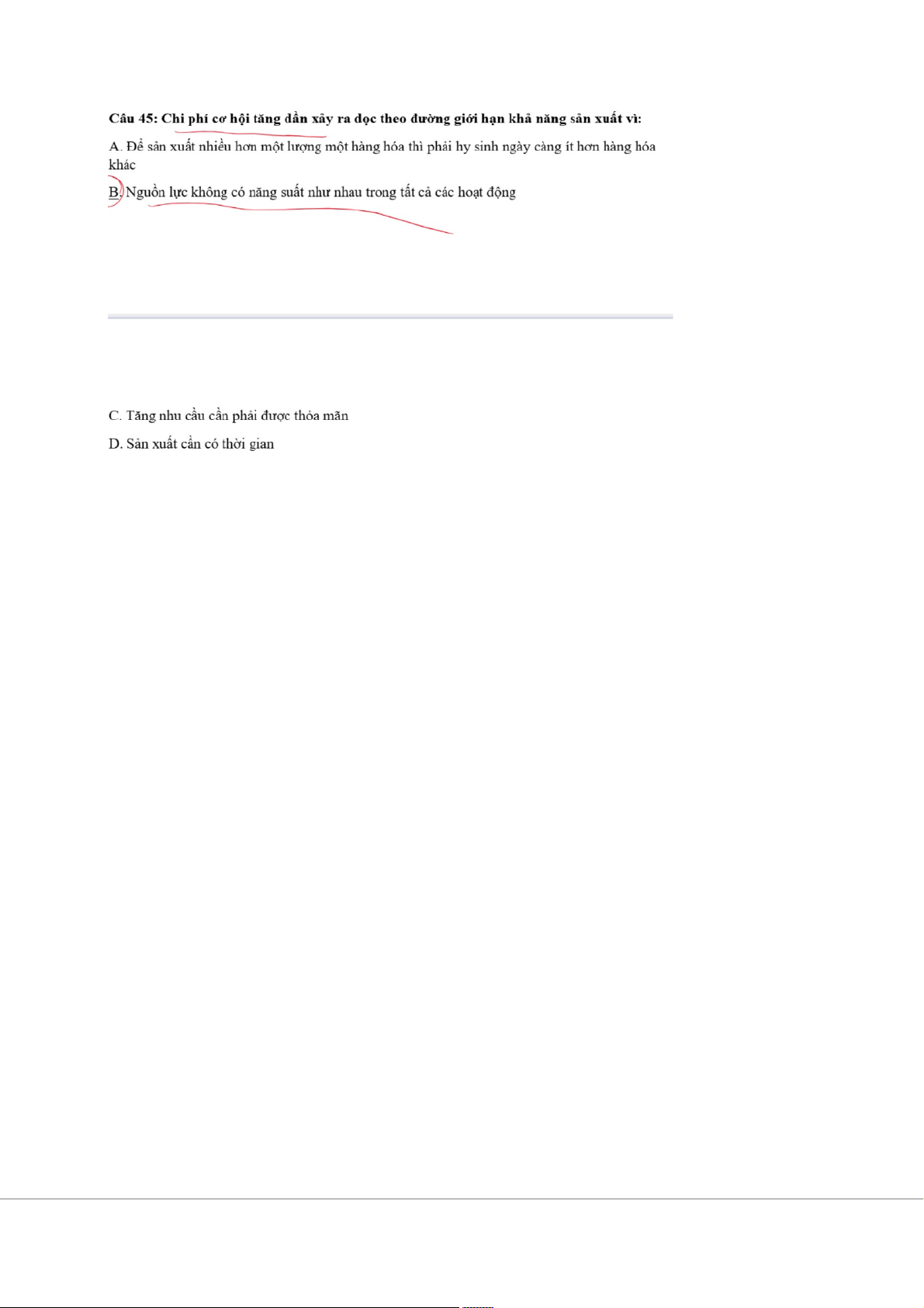 Câu 45.Chi phí cơ hội tăng dần xảy ra dọc theo đường giới hạn khả năng sản xuất vì: