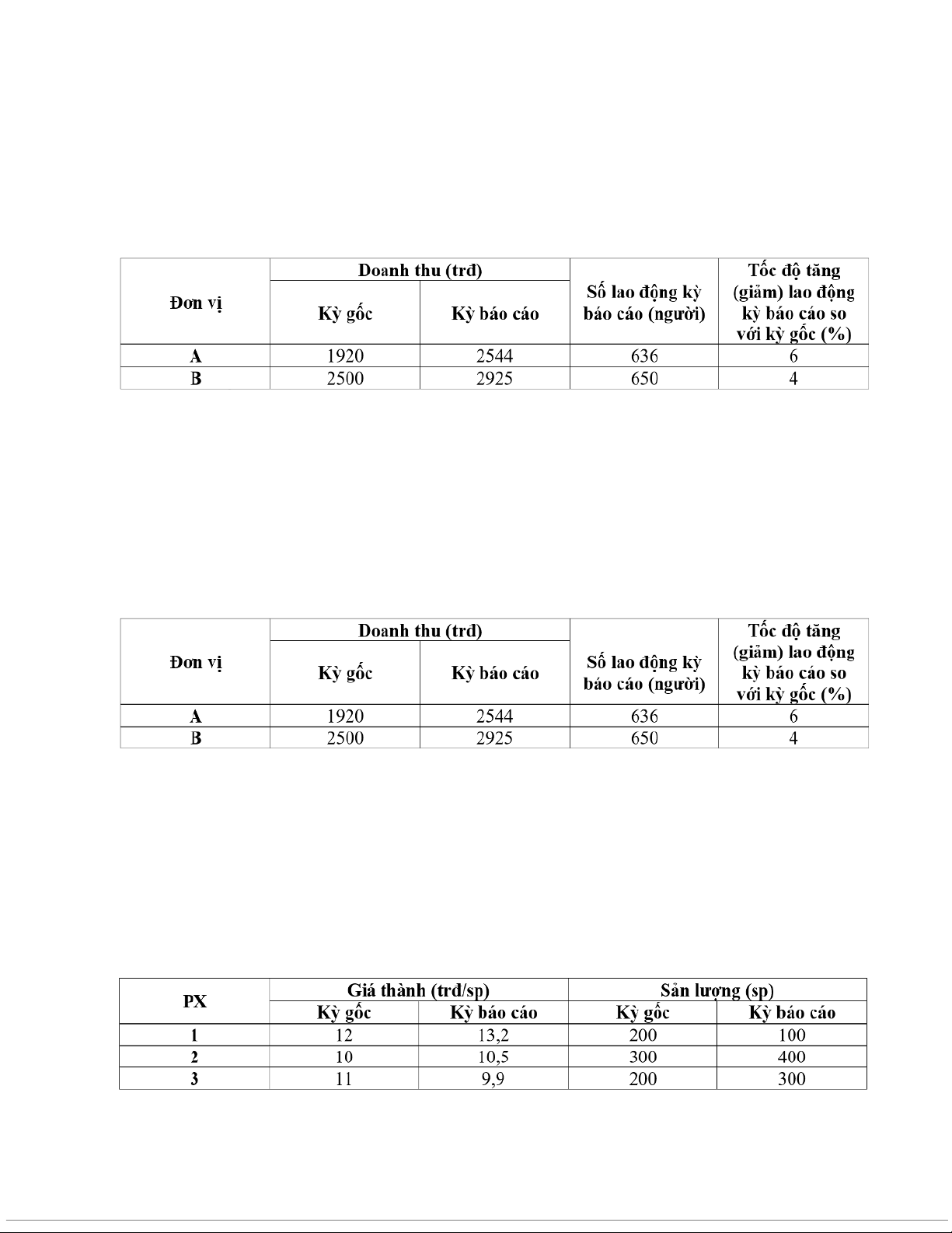 Tính năng suất lao động của đơn vị A kỳ báo cáo (trđ/CN)? A. 3,02. B. 4. C. 3,2. D. 3,39.